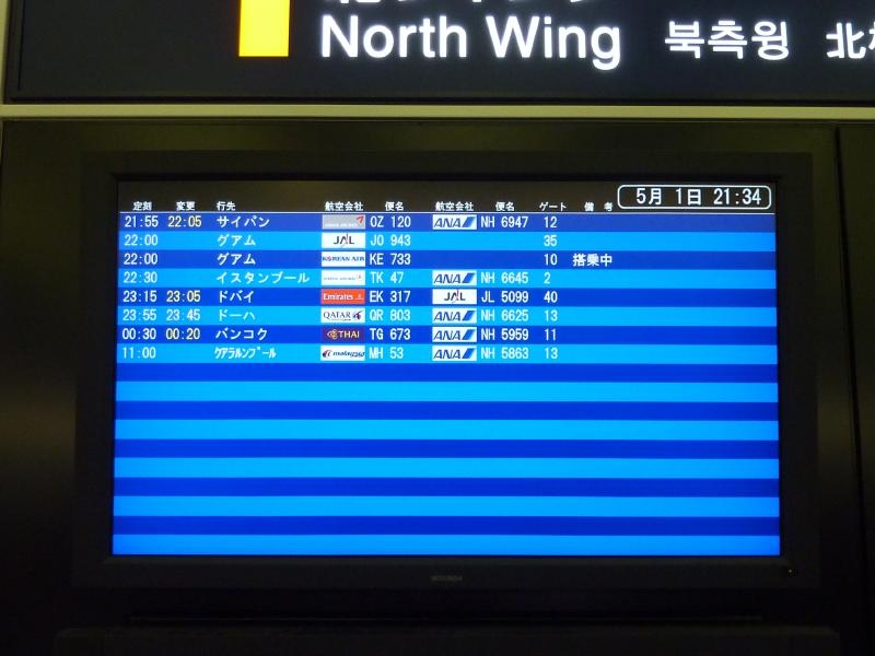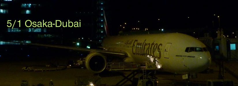 2007年末のモルジブ以来、久しぶりの海外旅行。それも6人家族旅行、これは2005年の南イタリア以来。そして久しぶりのエミレーツ、そして初入国のドバイとチュニジア。なんとも意味づけの多い旅が始まった。家族旅行構想は前からあったがようやくこのGWに実現することになった。今日は土曜日、エミレーツは深夜便なのでゆっくり準備をし、19時前に家を出る。ラピートを乗り継ぎ、20時過ぎに関西国際航空に到着。待ち合わせは21時なので、少し買い物をして、腹ごしらえをしようか。2階のうどん屋へ行く途中に待ち合わせ場所を通ると、すでにパパママは到着済み。車で来たので早めだね。荷物を見てもらい、われわれは讃岐うどんで腹ごしらえ。これが今日の晩ごはんだからね。21時前になり、弟たちも到着。6人が無事にそろったところで、アラブツアーのスタートだ。パパは会社に「中近東とアフリカに行ってくる」と行ってきたらしいが・・・4階の国際線カウンターへ行くと、もう夜も遅いのでがらんとしている。GWなので、昼間は混み合っていたんだろうね。エミレーツのカウンターはさほど混んでいるわけではないが、聞いてみると今日は8割くらいの予約だとのこと。でもいい感じの座席はもう埋まっているようで、なんとか4人並びと、3人並びの通路から2席をゲット。窓際に人が来なければいいんだけどなあ。さて、ゲートへ向かいますか。セキュリティや出国審査にも人は少なく、あっさり通過。