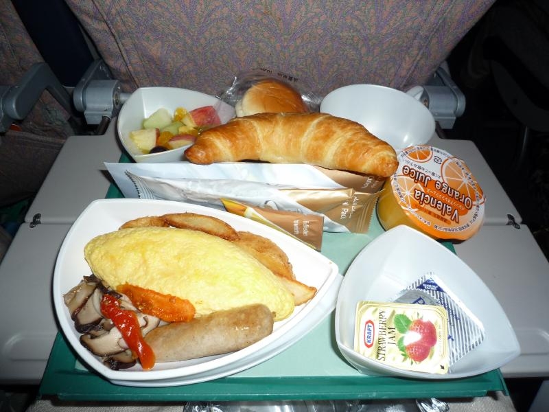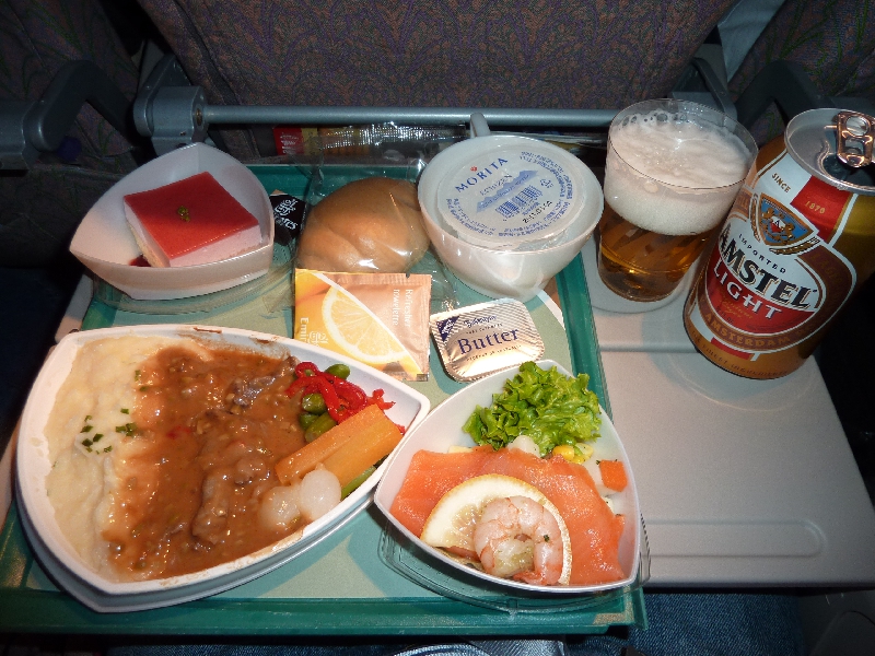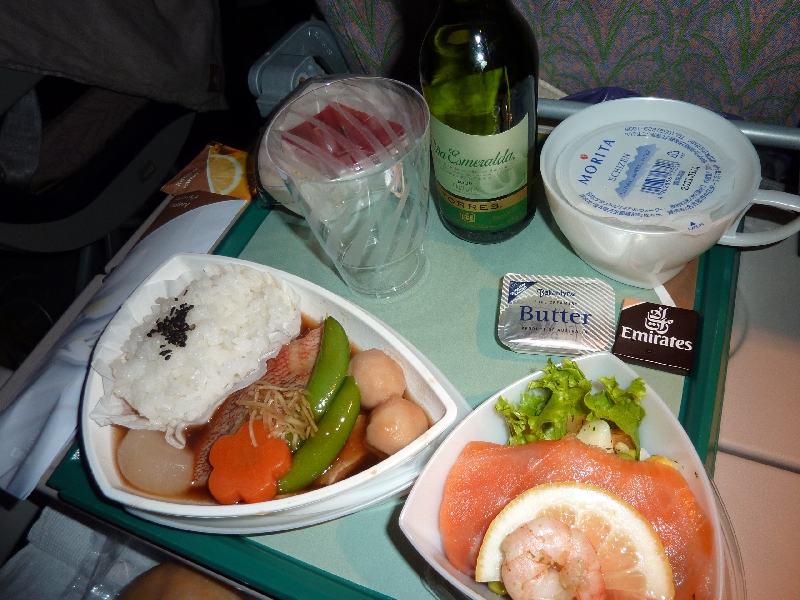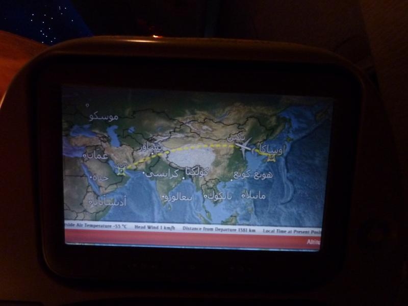 飛行機は韓国上空を順調に飛ぶ。現在位置の表示が単なる地図だけではなく、コクピットのような画面や飛行機のルートをアニメーション風に表示した画面など、見ているだけでも飽きない。しかもそれが英語とアラビア語で来るわけなので・・・そろそろ夜の軽食だ。まあ時間も遅いので、ここは軽くで。といいながら魚か牛肉のチョイスがあり、結構ボリュームのあるものが出てきた。やっぱりまずはビールで乾杯かな。さーちゃんは白ワイン。久しぶりの空の旅に、乾杯だ。まずはスモークサーモン。ディルとレモンの風味がさわやかで、出だしとしては十分。メインはビーフ、マッシュポテトが妙にたっぷりだが結構うまい。ビーフもやわらかいしね。魚を少しもらったが、和風の煮物。これもなかなかいい感じ。こうなるともうJALとは比べるようがないかな。軽食のせいか、種類は少なめだが今はこれで十分でしょう。おなかが満腹になったところで、少し寝ますか。