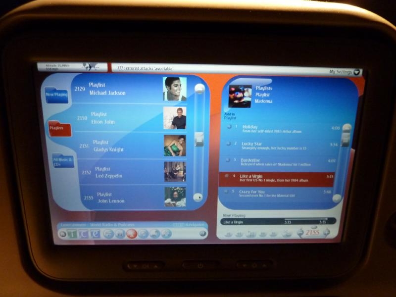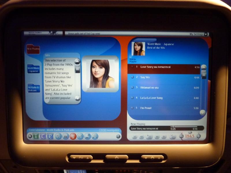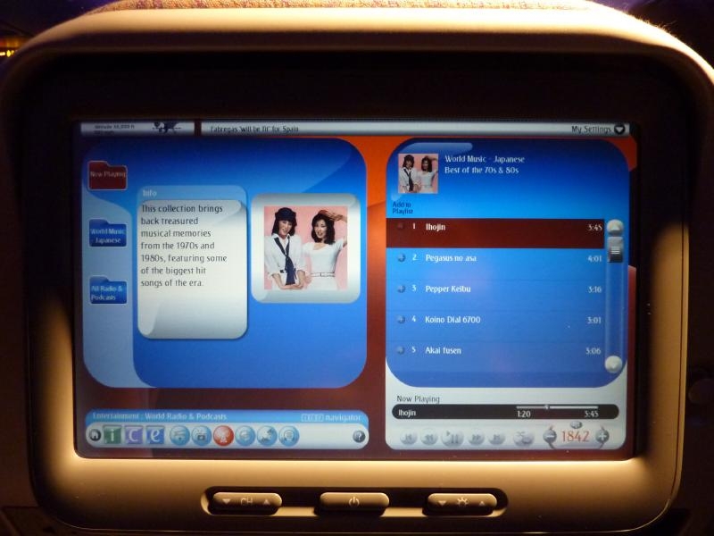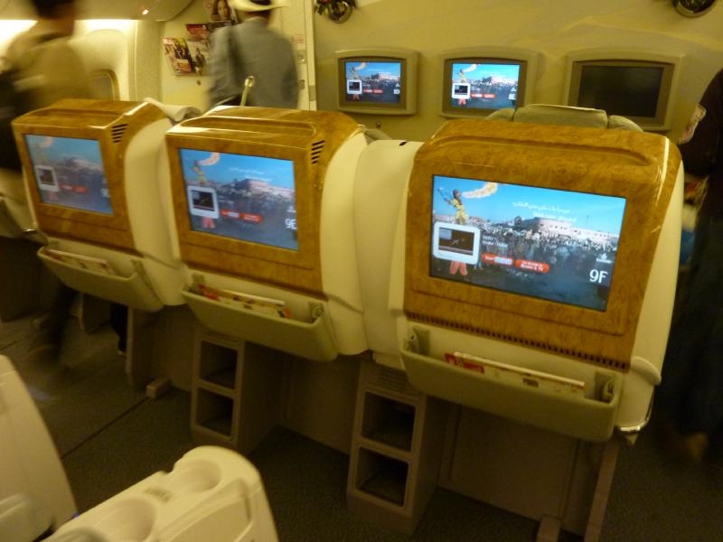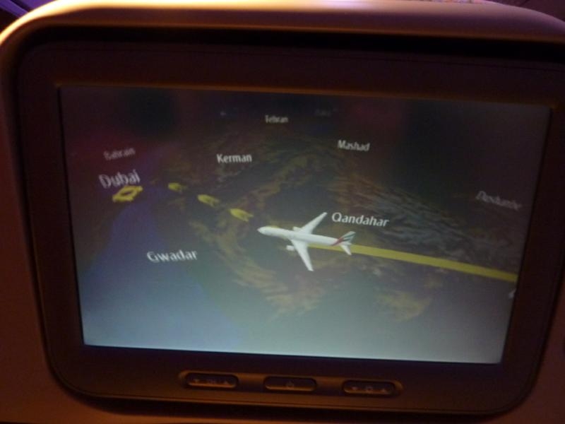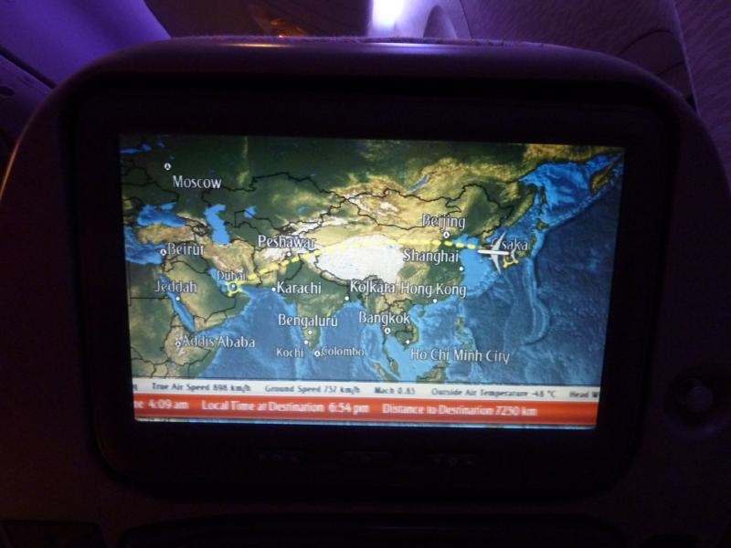 さて、搭乗が始まった。座席番号の都合で最後の方に乗ることになったのだが、乗った最初の印象はとにかく画面がでかい。以前乗った便から機材が新しくなっているので、エコノミーでも結構画面がでかいのだ。ビジネスはもうデスクトップパソコン並みのサイズ。さすがエミレーツだなあ。窓際の1席はずっと空いたままだが、このまま誰も来ないでくれ・・・定刻になり、飛行機は動き出した。やった、窓際が空いたのでこれで3列を2人、これはゆったり過ごせるぞ。幸先のいいスタートだね。離陸後、エンターテインメントプログラムを見てみる。機材が変わってプログラムも新しくなっているが、日本の歌は半分くらいは前と同じかな。でも映画もいろいろあるし、これは退屈しないだろう。そしてなによりうれしいのは電源。なんとエコノミーでも自席に電源があるのだ。これは作文書きにはたまらない設備だ。さらに進化したエミレーツ、やっぱりいいなあ。