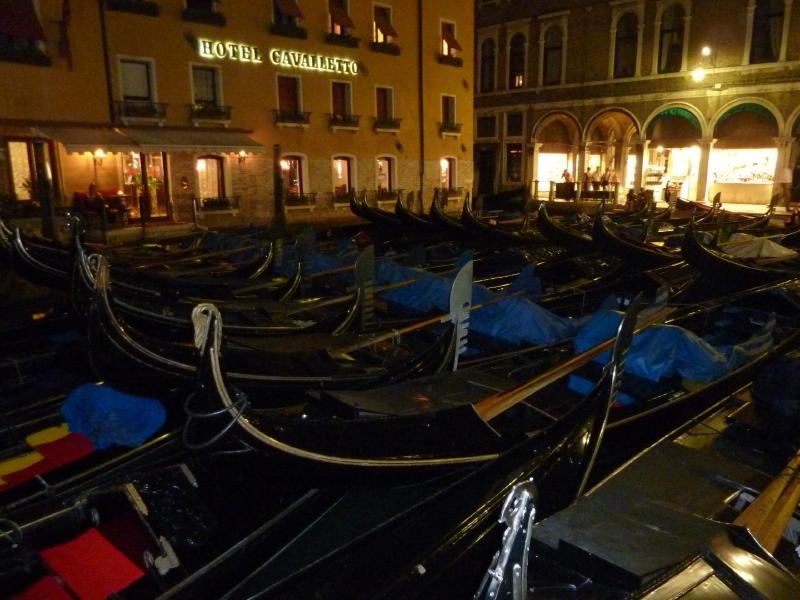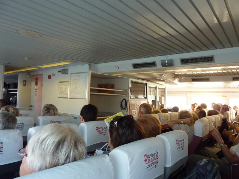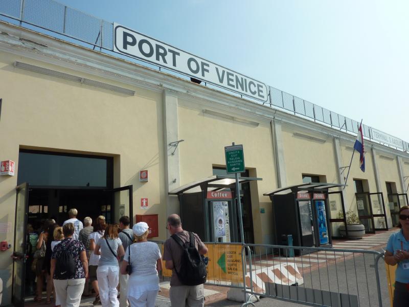 船は静かなアドリア海を進む。前半はほぼ眠りに落ちていたが、ずっとなにやらアナウンスが聞こえていた。目が覚めて改めて周りを見ると、どうやら日帰りツアーの人たち向けにベネチアの説明をやっている。最初はフランス語、そのあとは英語といった感じで延々と続く。もうちょっと静かな船旅だと思っていたのだが・・・到着まで30分くらいのところで、ベネチアの街並みが近くに見えている。ここからはスピードを落とし、運河の中をゆったりと目的地に向かって進んでいく。窓があまりきれいではないので外の様子がはっきりとは分からないのが残念。定刻の10時半ごろ、船はベネチアのバジリオ港に到着した。 | ||||||