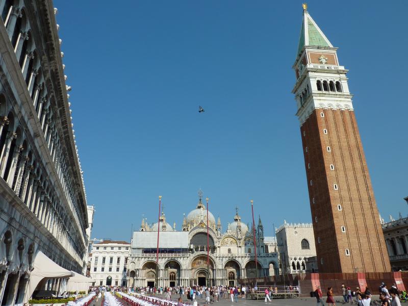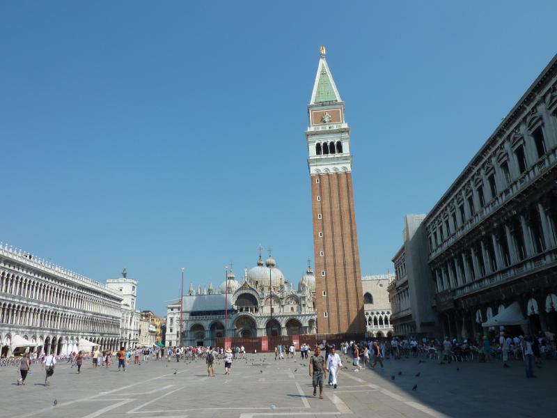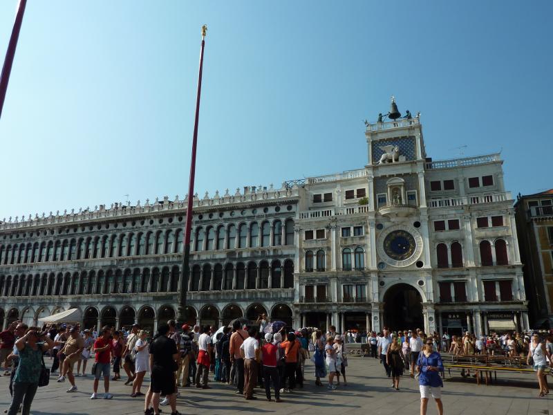 サンマルコ広場に戻る途中、クーナを両替できるところがあった。あまりレートはよくないが、まあ仕方がない。42クーナが4.81ユーロになりました。1ユーロ130円くらいの感覚かな。広場に戻り、まずはサンマルコ寺院に入ろうとするとものすごい行列。広場を越え、海岸沿いの道まで伸びているように見える。これはちょっときついぞ。鐘楼はどうだろうかと思って行ってみると、こちらはほとんど行列がない。ではまずはこちらに上りますか。