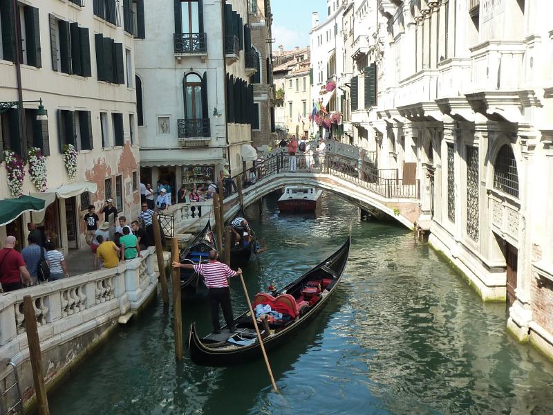 そろそろ出かけますか。ホテルの場所がわかってしまうと簡単なのだが、一本間違うとなかなかたどり着けなくなるのがつらいところ。まあこれがベネチアだよね。日差しが強いのでなるべく日陰を選んで歩こう。まずはサンマルコ広場へ。久しぶりだなあ。寺院や鐘楼には後で行くとして、まずは昼ごはんだ。聖堂横の道を少し歩いていくと、トラットリアやピツェリアがたくさんある。でもやっぱり目立つのはジェラテリアかな。あまりの暑さにあっという間に溶けてしまいそうだけどね。