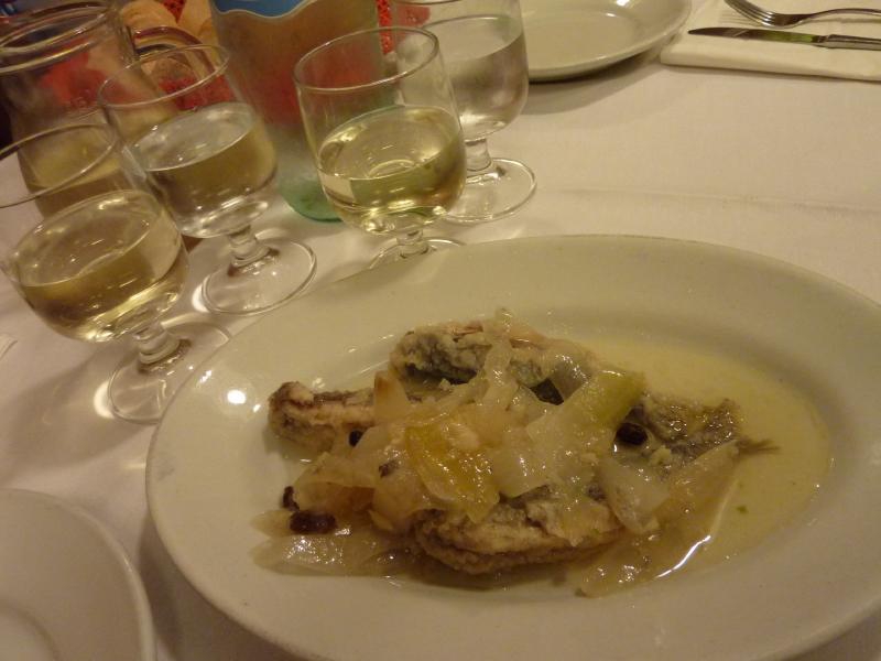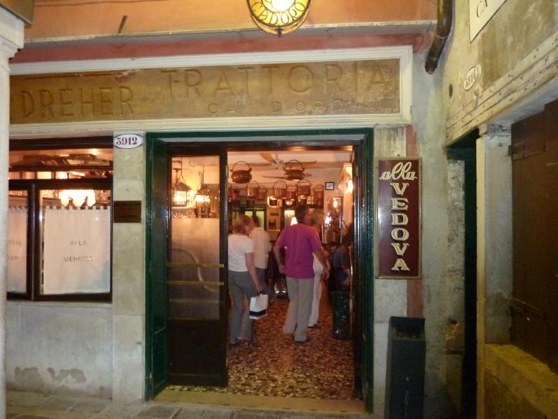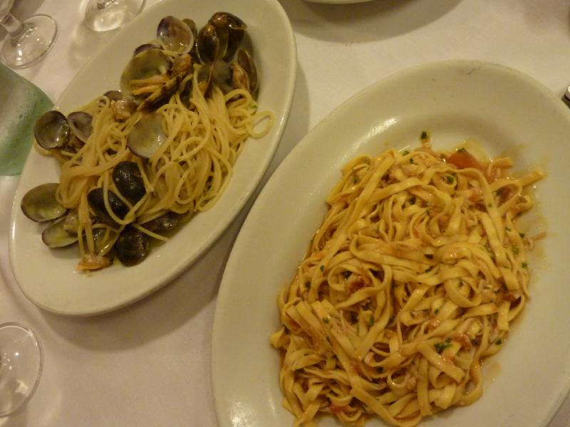 さて、目指すトラットリア・アッラ・リベッタに到着。そんなに大きくない店だが、地元らしき人もたくさん入っているようだ。奥の部屋に案内され、しばらくするとゴンドラの漕ぎ手であるゴンドリエーリ3人組も入ってきたしね。さて、久しぶりのイタリア、しかも海のヴェネチア、当然魚介系を中心にいただきましょう。まずは前菜にサーディン、つまりイワシの南蛮漬けのようなもの。この酸味と青魚の風味がいいですね。白ワインとともに、美味しくいただく。そして次はパスタ、やっぱりまずはボンゴレと、あとはカニのパスタをいただく。やっぱりイタリアのパスタはうまい・・・少し塩気が強めだが、それが一つのポイントかな。しっかり完食し、ごちそうさまでした。エスプレッソで締めて、これで51ユーロ。51?高いなあ。確かにワインがちょっと高めだったが、クロアチアの物価からはかなり上がった気がする。まあもともとベネチアって高いんだよね・・・ユーロが安いので5500円くらいなのががまだ救いだが、これがアルザスの時のレートだと実に8000円超えることになる。昼にパスタと軽くワイン飲んでその値段はありえないなあ。仕方ない、うまく選んでいきましょう。 | ||||||