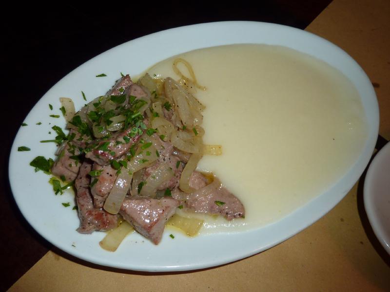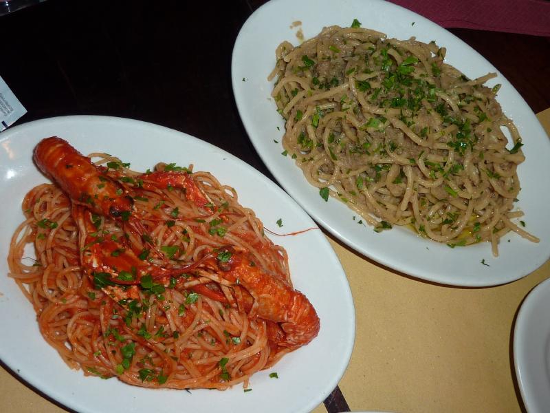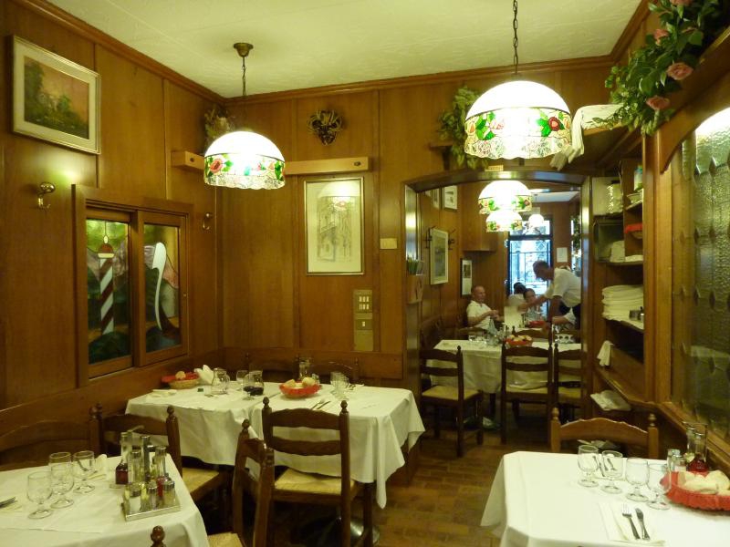 しばらくして、パスタが登場。一つはSpaghetti alla busera(スカンピのピリ辛スパゲッティ)。トマトの鮮やかな赤がよく、ここにスカンピの海老風味がしっかりと感じられて、甘さを感じられるくらいの味だ。いいですねえ。もう一つはBigoli in Salsa(玉葱とアンチョビソースのパスタ)という、ベネチア料理のひとつ。イワシとタマネギがたっぷり入っていて、タマネギの甘さと青魚の風味が実にうまい。やっぱりイタリアのパスタはおいしいですね・・・次に来たのはFegato alla veneziana(仔牛レバーのソテー)。これもベネチア料理のひとつで、臭みのないレバーにポレンタをからめつつ食べる。不思議な食感だが、ポレンタの塩気とレバーがいい感じでワインの進む一品です。お店はますますにぎわってきてきたぞ。カフェをいただき、これで締める。ごちそうさまでした(42ユーロ)。 | ||||||