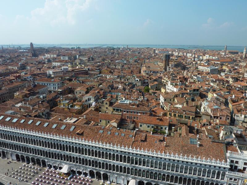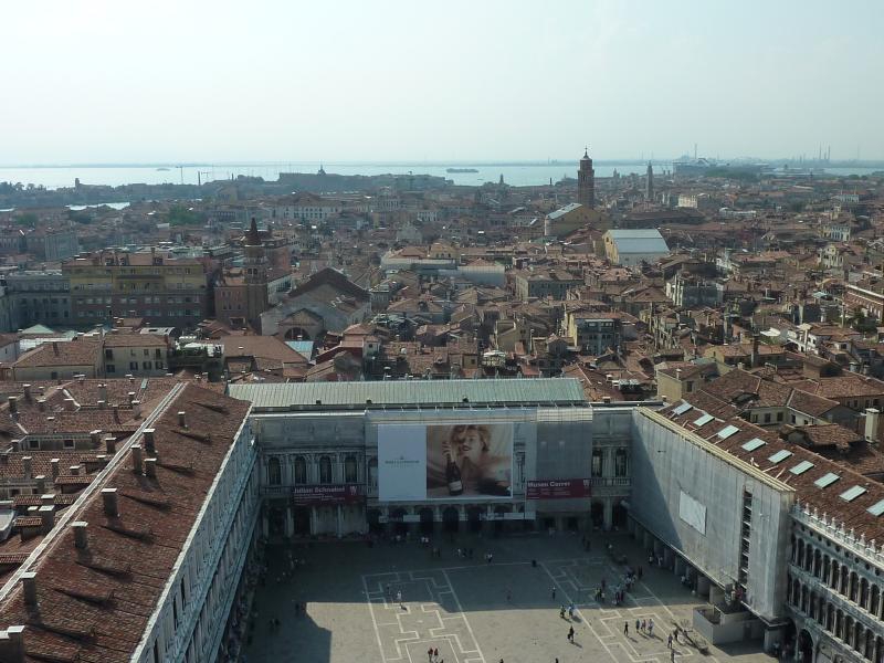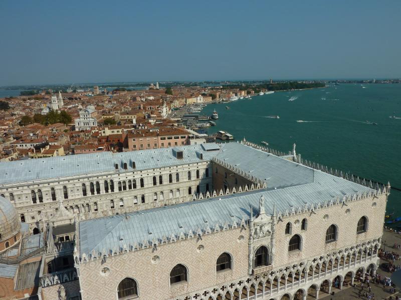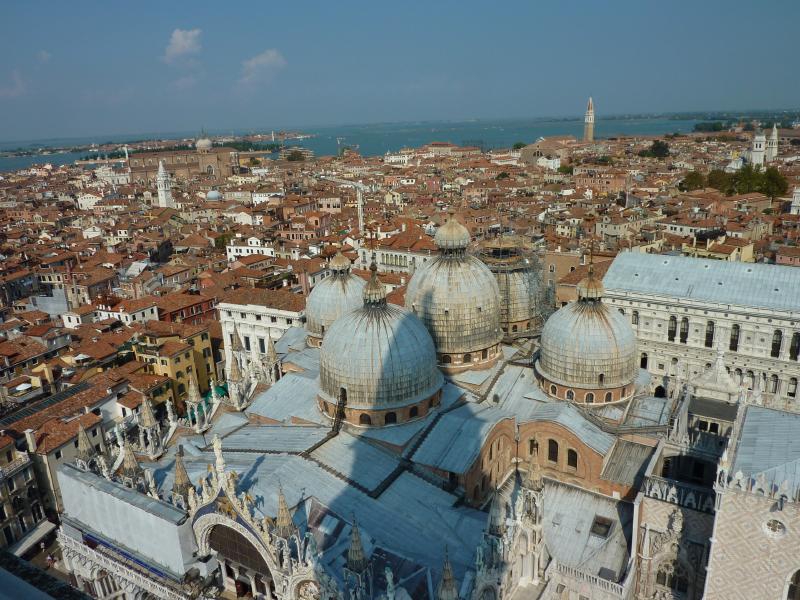 チケットを買い、エレベーターで頂上まで(@8ユーロ)。96.8メートルある鐘楼、その展望台から眺める景色は素晴らしい。サンマルコ寺院や広場の眺めはもちろん、一面に広がるオレンジ色の屋根、ところどころに見える聖堂や教会、運河を隔てて見えるジュデッカ島やサンジョルジョマジョーレ島、そして遠くにムラーノ島などの島々、これは絶景です。どことなくドブロフニクとも共通の雰囲気があるぞ(これはドブロヴニクが「よいベネチア」という意味があるからだということをこのあとウルスラから教えてもらった)ひとしきり景色を楽しみ、そろそろ降りますか。