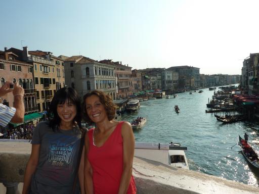 さて、そろそろ時間。ホテルを出て、サンマルコ広場へと向かう。ここの世界最古のカフェ前にて待ち合わせ。そして、無事にウルスラに会うことができました!よかったね。久しぶりの再会で、さーちゃんとの会話がはじけます(ほぼ日本語で)。さて、ここからはベネチア街散歩。まず向かうのは、リアルト橋。迷路のような道を、知り尽くした地元の人の案内で歩く。これは安心だ。ほどなくリアルト橋に到着し、まずはここで運河を眺める。なんでも今日は人が少ない方らしく、いつもはこんな風に写真を撮るのも難しいらしい。十分に人が多いけどね・・・リアルト橋を渡り、しばらく行くとそこは市場エリア。さすが先生、さーちゃんの好みをわかっている。今は果物市場が少しある程度だが、午前中にくれば魚市場も開かれているらしい。ここはまたぜひ来てみましょう。その市場の近くには、ゴンドラ乗り場がある。といっても観光用ではなく、向こう岸にわたるためのいわゆる渡し船、生活の足。一人0.5ユーロで渡れるので、これも是非またチャレンジを。もともとはこのあたりでお茶する予定だったが、なんだか騒がしい感じなので別のところへ行きますか。ということでリアルト橋を渡り、劇場跡やマルコポーロ生誕地など、いろいろと案内をしてもらう。 | ||||||