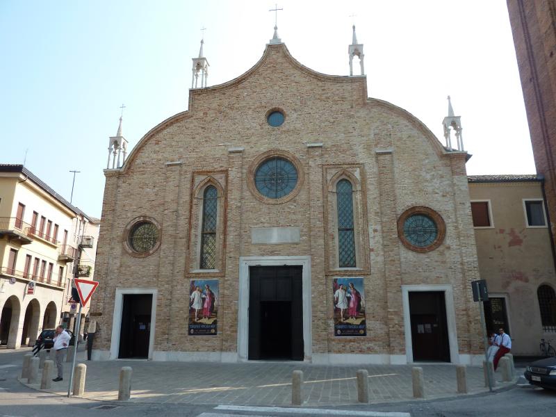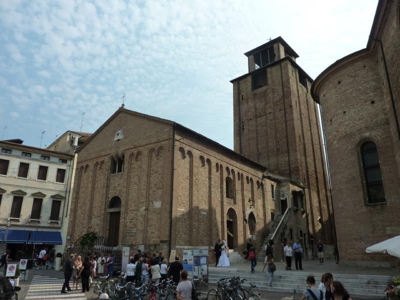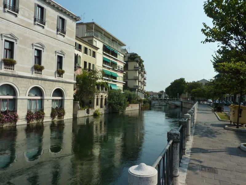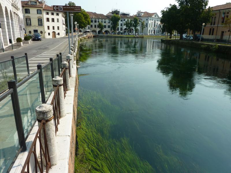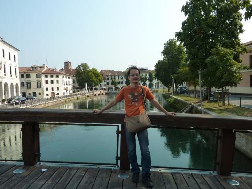 ゆったりと座れるがかなり空調が聞いていて少し肌寒いくらいだな。妙に眠くなったりもしながら電車の旅は進み、あっという間にトレヴィーゾ駅に到着。駅構内にはきれいなキオスクやショップがあり、駅前からは緑や川が見え、メストレとはがらっと異なるいい雰囲気だ。そうねえ、イタリアの街って普通こうだよねえ。ここに泊まればよかったかな。駅でキャッシングをして(@70ユーロ)、では街歩きに向かいますか。中心街にはドゥオモや教会などがあるのでそちらに向かって歩くのだが、ここトレヴィーゾは水がきれいな街らしく、街中には川が流れている。水は東レの、はトレビーノだが、何か関係あるのかな。 散歩が気持ちよく、いい感じの街だ。