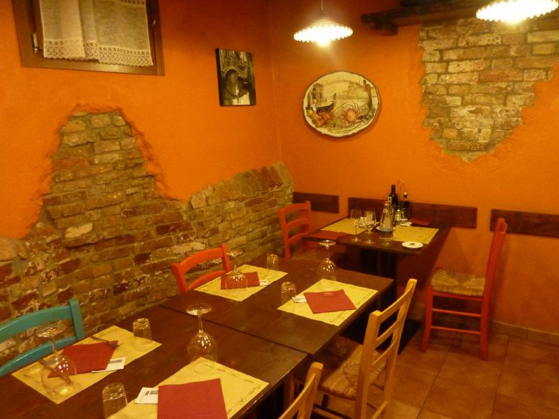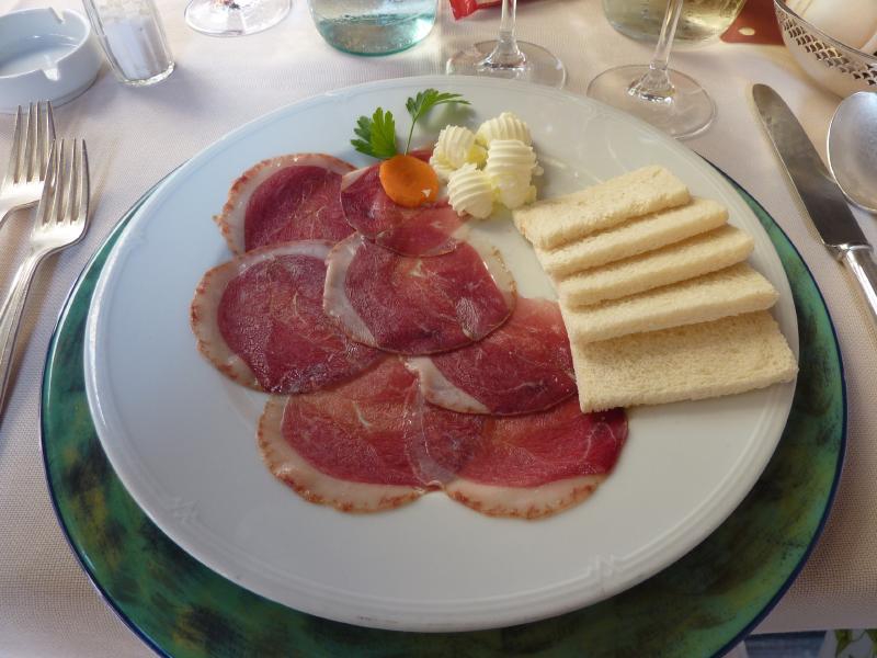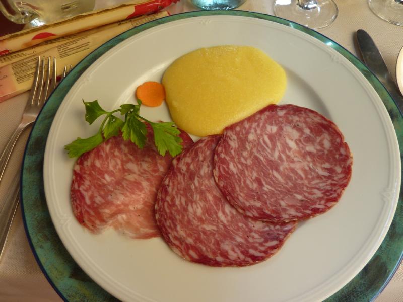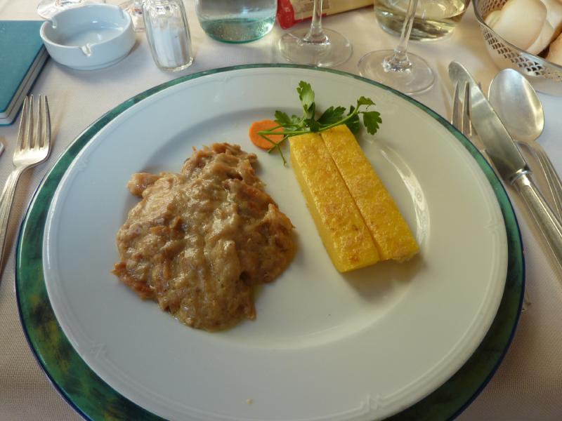 さて、そろそろ昼ごはんかな。せっかくなので昨日教えてもらったお店に行ってみよう。大きな広場から少し入ったところにある小さめの広場にあるそのレストランに行ってみると、なんと昨日のおばさんたちがいました。明日行くって言ってたしね。再会を喜び、ちょうど空いていた隣の席に着く。どうやらおじさんがお店の人に、「昨日ベネチアのマドンナであった日本人で・・」みたいなことを言ってました。ちょうどおばさんたちも前菜を食べ終わったころかな。さて、どうしましょうか。昨日まで海のものをしっかり食べていたので、ちょっと今日は山系で行きましょうか。ということでまずは前菜、トレヴィーゾ風のハムと鴨の燻製。白ワインとともにおいしくいただく。特にハムについていたとろっと粘りのあるポレンタがなんともおいしい。この味にもだいぶ慣れてきたようだ。と、おばさんたちにはメインが来たぞ。バカラという干しダラの料理に付け合せがポレンタ。これもなかなかおいしいらしい。こちらもにもメインが登場で、さーちゃんはそのバカラ、もう一つはひな鳥のグリル。バカラはタラの食感がしっかり感じられ、確かになかなかおいしい。鳥はおいしいのだが、少しパサパサ感があるかな・・・でもどちらもおいしくいただきました(65ユーロ)。 | ||||||