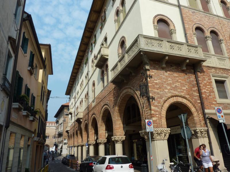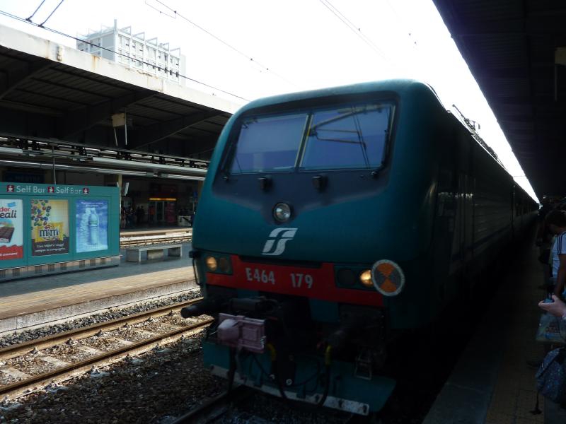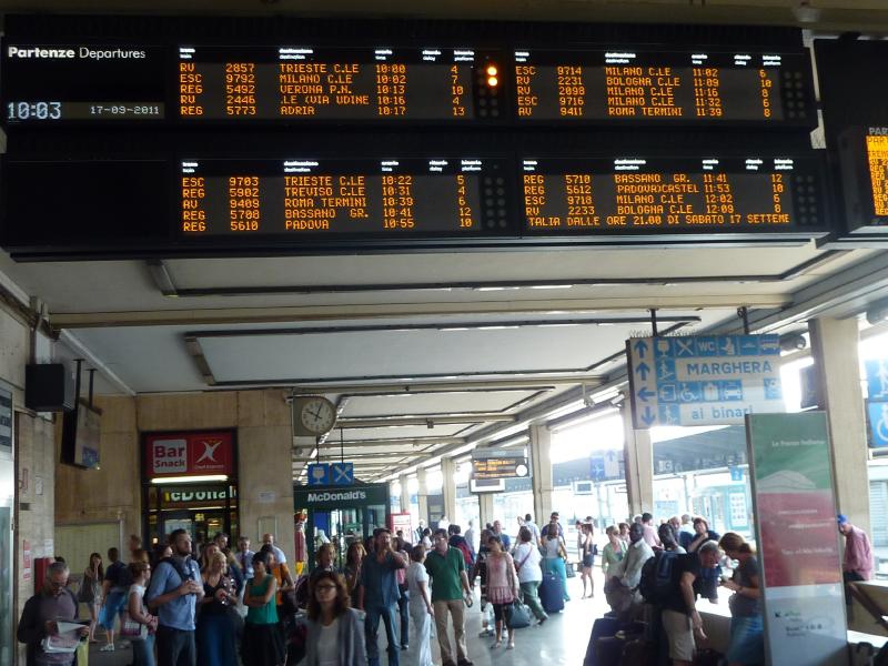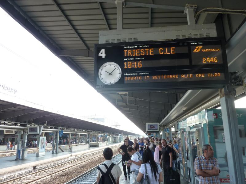 今日も7時起き。8時半ごろ朝ごはんに向かう。結構にぎわっているぞ。ここもハムやチーズなどいろいろあるが、3泊するので今日はほどほどに。でもモツァレラはしっかり食べておきたいね。さて、今日は近郊の街へ行ってみよう。電車でわずか15分ほどのところにあるトレヴィーゾ、いろんな人からおすすめされたし、昨日お昼に会った隣のおばさんからはおすすめレストランを教えてもらっている。では行きますか。メストレ駅に行き、まずは切符を買う。窓口が結構並んでいたので、自動販売機にチャレンジだ。英語表記を選択し、行先を選択し、座席クラスを選択し、人数を選択し、カードを入れ、PINコードを入れたらそれで完了。チケットが出てきた。最後のPINがちょっとわかりづらくて後ろの人に教えてもらったりもしたが、これは簡単だな。次はイタリア語版も見てみよう。もうすぐ電車が来るのでホームに行くと、たくさんの人が電車を待っていた。これはトリエステ行き、時間があればそこまで行ってみたいね。しばらくして、珍しく時刻表通りに電車が到着。距離が近いしあまり値段の差もないので、今日は一等車にしてみました(@4.2ユーロ)。