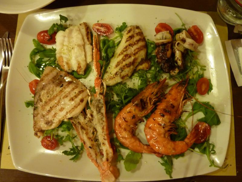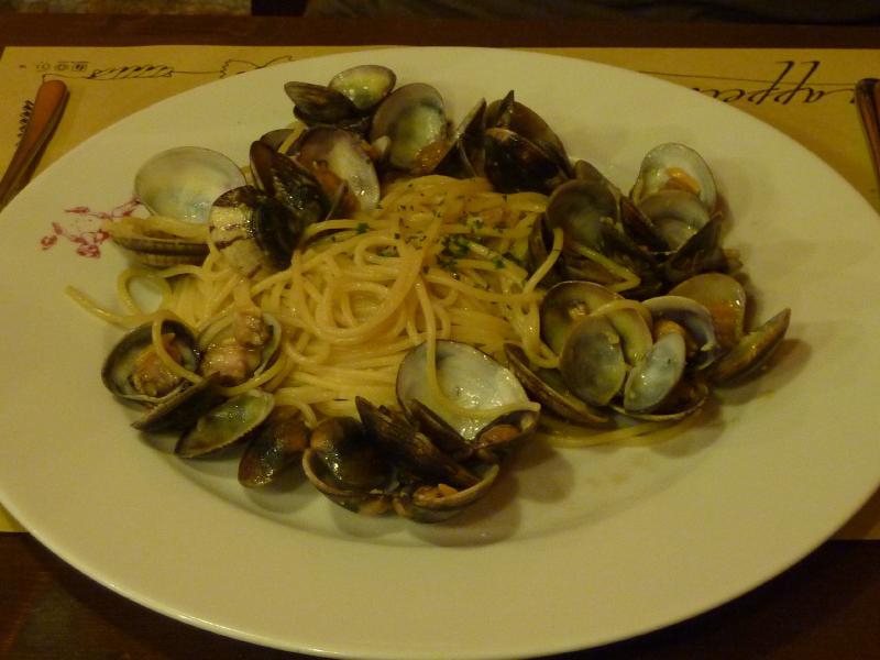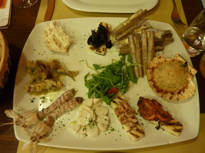 そろそろ暗くなってきた。晩ごはんに行きますか。メストレ駅付近はあまりよくないので、ベネチア本島へと向かいましょうか。メストレから電車に乗ろうとすると、かなり遅れているようだ。我々は来た電車にのればそれでいいが、本来の到着時間を30分以上遅れていたらしい。やっぱりイタリアですねえ。ベネチア・サンタルチア駅に着くと、行先の表示板には軒並み遅れの表示がある。中にはすでに出発がキャンセルされたものもあり、ローマとかの長距離便でそれは困るよね。これだからイタリアの電車旅行は安心できない・・・駅前の広場はやっぱり人が多いが、一日あいたこともあって少し気分は新鮮、やっぱりこの独特の景色は旅気分を盛り上げてくれます。ここからは賑やかな通りをずっと歩く。通り沿いにあるレストランは、どこもにぎわっている。10分ほど歩いたところから、少し広場の裏側に入っていく。今日は日本のイタリア料理屋さんで教えてもらったCANTINONという店に行くのだが、知らなかったら出会えないようなところにそのお店がありました。では入りますか。中に入ると、明るくていい感じのお店だぞ。奥の部屋の席に着き、さてどうしましょうか。もうベネチアでの晩ごはんは最後だろうから、思い残すことのないようにしたい。ということで、前菜はDelizioVenezia、さしずめベネチアの海の幸盛り合わせ、その後ボンゴレそしてメインはグリルの盛り合わせとしましょうか。まずはいつもの通り、ハウスワインの白でのどを潤す。と、隣の席に巨大な盛り合わせが運ばれてきたぞ。前菜っぽいので、あれが来るのか?そして予想通り、来ました前菜盛り合わせ。これはまるで、イタリア版おせちのようだな。たくさんの海の幸が大きなお皿に並んでいて、でもこれは嬉しい組み合わせですね。エビもあればシャコもあるし、ホタテもあればイカもあるし、そしてマテガイもあるし、これまでに食べたものや食べたかったものがたくさん並んでいる。これは白ワインともよくあい、食が進みます。ご機嫌に完食すると、次にボンゴレとメインのグリル盛り合わせが同時に出てきた。これは・・・すばらしい。グリルはエビやスカンピ、魚の切り身などたくさんの魚介が炭焼きされたものが並んでいる。一見すごい量だが、殻もあるし半分ずつなので、ちょうどいい感じの量かな。ボンゴレももちろんうまいし、ベネチアの海の幸、これで本当に堪能した気分になりました。お店の人も明るくていい感じだし、いいですね。