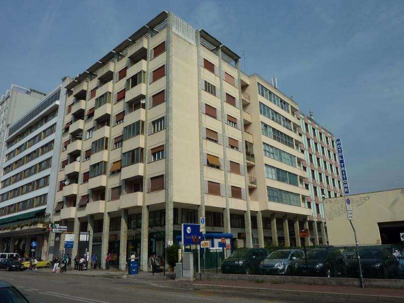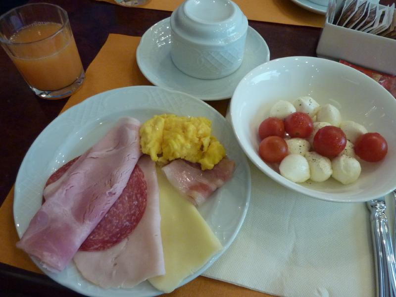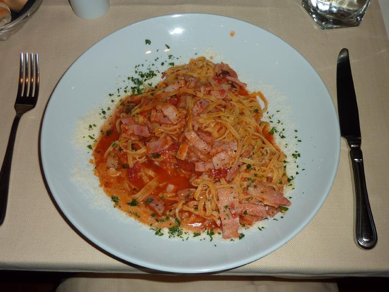 ホテルに戻り、ほっと一息。なんだか妙に疲れたので少しシェスタかな。夕方になり、部屋の電話が鳴った。ウルスラだ!最後に電話をかけてきてくれたのだ。仕事が忙しくてもう会えないのは残念だが、街の案内や一緒の食事など、いろいろとお世話になりました。次はぜひ日本で会えるといいね。さて、おなかが減ってきたぞ。明日の出発がかなり早いし荷造りをしなきゃなので、今日は近くのお店でさらっとパスタでもいただきますか。外に出ると、妙に寒い。確かに天気予報では明日は雨でぐっと気温が下がるらしいが、ここにきて急に肌寒くなった。ここまではこれでもかというばかりの晴天が続いていたのだが、本当はこのくらいの気温で晴天ならばベストなんだけどね。そんなに外を歩くわけではないので半袖のまま出かけ、メストレ駅前にあるカフェ風のお店に入る。ここでミートソースのタリアテッレとスパゲッティアマトリチャーナを注文。妙にリゾットを進められたが、今日はトマトのパスタ気分なんでね・・出てきたものは、結構な大盛りサイズ。ほかに何も頼んでいないが、これで十分だな。このあとの荷造りのためにお酒もなしにして、イタリア最後のパスタを楽しむ。こういう店の割には結構おいしいのがさすがイタリアかな。最後はカフェで締め、ごちそうさまでした(29.25ユーロ)。