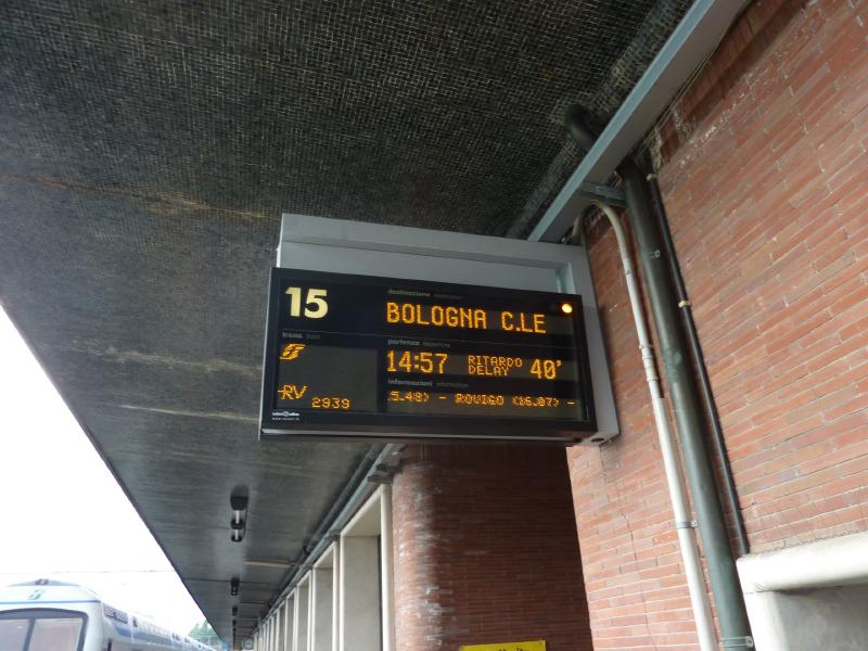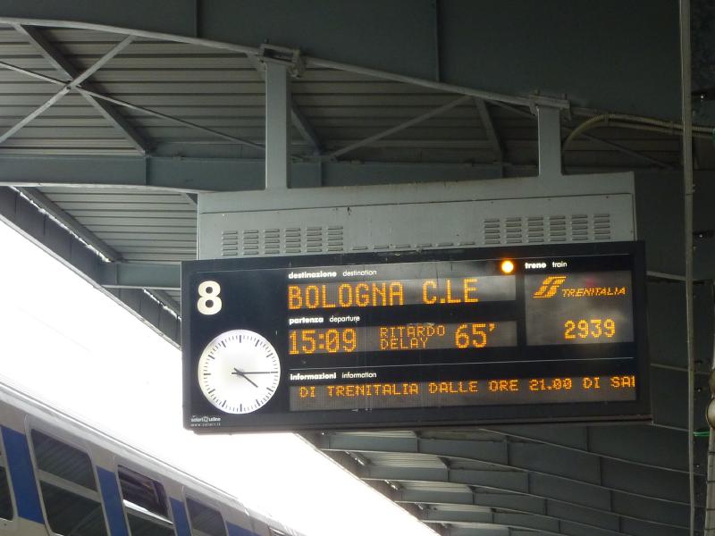 電車に乗ろうとすると、やっぱりまだストライキが進行中。今から最初に出るのはボローニャ行なので、とにかくそれに乗りましょう。すでに40分遅れと出ていたこの電車はなかなか出発せず、結局メストレについたのは定刻から65分遅れ。なんともはや・・・みんな困るよね。このあたりはいったいいつになれば改善されるのだろうね。がんばれイタリア!