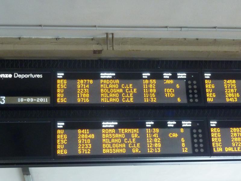 次の便は11:41なので、まずはガゼッタを買おう(1.2ユーロ)。いわゆるスポーツ紙で、やっぱりサッカーが中心。中を見ると、長友や森本の名前もある。日本代表として、これからも活躍してほしいものです。さて、まだ時間があるのでとりあえず明日の空港行きのチケットでも買いに行きますか。朝7時の便に乗りたいのだがチケット売り場が6:55からなので、前もって買っておけば安心だ(@5ユーロ)。駅に戻って表示板を見ると、なんと11:41の便がキャンセルになっている。どういうこと?次の便は12:13なのでまだいいが・・・ちょっと時間があるし、駅は人で混み合っているのでしばらくはホテルのロビーで待つことにしよう。うーん、イタリアらしいといえばそうだが、これはちょっと困るなあ。ほかにもキャンセルになった便もあるようだし、今日が日曜だから?12時前になったので、そろそろ行きますか。駅に着くと、ちゃんと表示板には12:13の便が出ているしホームも表示されている。ではホームに行って待ちますか。ほかにも何人かが待っているようだが、ただホームにある表示板にはなかなか表示されないなあ。しばらく待つが、いつまでたっても表示されない。そろそろ発車時間になるが、遅れているのかな?そして再度表示板を確認しに行くと・・・なんと何事もなかったかのように、表示板から消えている。 | ||||||