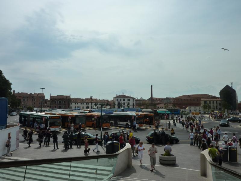とりあえずメストレの街を少し歩いてみますか。駅前の雰囲気はいまいちだが、駅を背に大通りを進んでいくとショッピングセンターとかあるらしいので・・・との情報を頼りに歩いてみるが、特に変化はない。このまま歩いても何もなさそうなので、どうしましょうか。この大通り沿いにはバス停があり、ちょうどベネチア行のバスが来た。もうこれに乗ってしまおう。昨日の夜でもうベネチア本島は終了と思っていたが、最後の最後までやはりベネチアかな。まあバスで入るのもちょっと新鮮だしね。ということで、バスはベネチア本島で唯一車の入れるローマ広場に到着。バス停や駐車場、レンタカーのオフィスなどがあり、結構広いんだね。