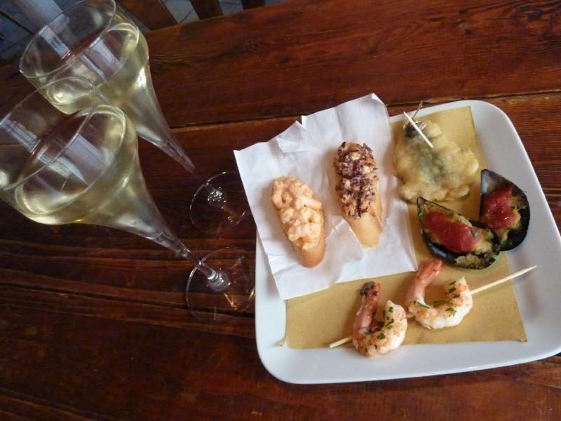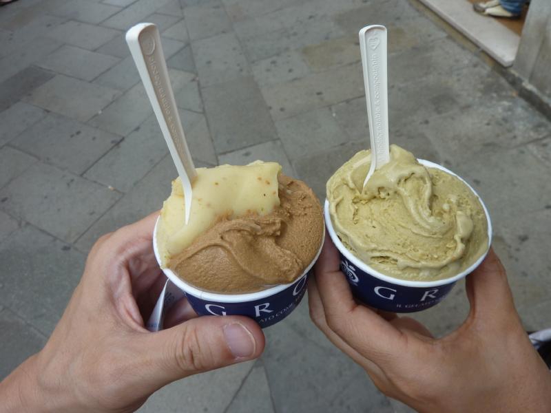 駅から10分ほど歩くと昨日の夜行ったCANTINONのあたり、そしてこの近くにそのバーカロがある。とりあえず中に入ってみよう。カウンターの上にはいろいろとおつまみ系が並んでいるぞ。立ち飲みもできるが奥のテーブルでもOKなので、テーブル席にしましょうか。イタリア語の実践ということで、さーちゃんに買ってきてもらおう。少し発泡系のワインがすっきりとおいしい。あとはエビやムール貝、イワシのフリットなど。こういうちょっとしたおかずをつまみにワインをいただくのもいいね。どれもワインによく合うので、食が進みます。つまみはおかわりということで、マグロのフリットやオムレツなどをゲット。こちらもどれもおいしいが、タマネギのオープンサンドを食べてみるとこれがみごとのゴルゴンゾーラ。かなり強い風味で、さーちゃんほんの一口で撃沈。さすがにこれでベネチアを締めるわけにはいかないので、お店を出る(@20ユーロ)。最後にジェラートをいただきましょうか。バーカロを出て、一昨日も行った GROMへ。今日は妙に人が並んでいるぞ。さて、最後なので一人1個、さらにさーちゃんはピスタチオ尽くし、そしてもう一つはカフェとイチジクにしてみました。今回のピスタチオは前回のようにチョコに負けることもなく、さーちゃんご機嫌に完食。カフェは結構ビターだが、イチジクの濃いめの甘みとでちょうどいい感じ(@2.5ユーロ)。 | ||||||