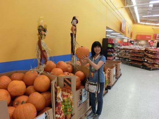 さて、まずは近くにあるウォルマートというスーパーへ。中に入ると、まずはハロウィーン用の巨大なカボチャがありました。店内はいかにもアメリカという感じで広くて品ぞろえが豊富。なにより一つ一つが大きいのだ。肉とか果物とか見ているだけでも楽しいが、冷凍食品やアイス、お菓子類などのサイズはやっぱりアメリカン。でもせっかくなのでいろいろ買いましょうか。タコスの材料やジャム、クッキーなどを選ぶ。日本製でアメリカ向けのわさびマヨはお土産になるかな。うーん、こういう場所はいくら時間があっても足りないが、次の予定もあるのでここはこのくらいにしましょうか。