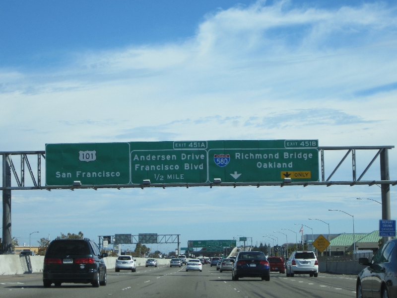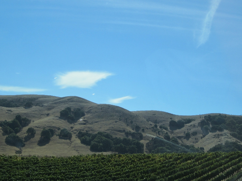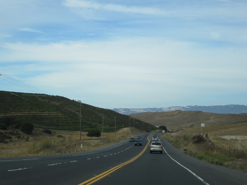 では出発しますか。しばらくはブドウ畑の中をずっと走っていく。この景色もそろそろ見納めかな。37号線のフリーウェイに入り、快調に走っていく。運転や車線変更にもだいぶ慣れてきたな。そしてこのあと101号線に合流すると、交通量が急に増えた。あともう少しなので、とにかく安全運転でね。