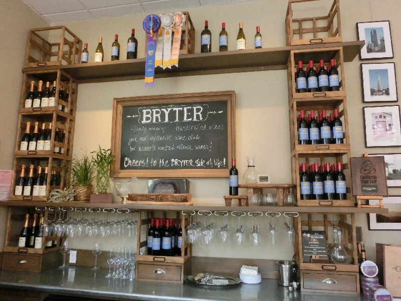 せっかくなので、どこかでワインの試飲をしようかな。いくつかお店はあるが、ナパバレーほどにぎわっているわけではないのでちょっと入りづらいなあ。しばらく歩いていると、お店が並んでいるいい感じのエリアを見つけた。SONOMA COURT SHOPSいうこの場所には、ワインショップもいくつかある。よし、どこかに入ろうと思って中をのぞきながら歩いていると、BRYTERというお店の人が満面の笑顔でこちらを見ていた。うん、その笑顔にひかれてしまいましょうか。中に入り、まずはワイナリーの紹介。なんでもこの名前はご夫婦の名前の一部を合わせたものらしく、奥さんも登場です。さて、ワインをいただきますか。