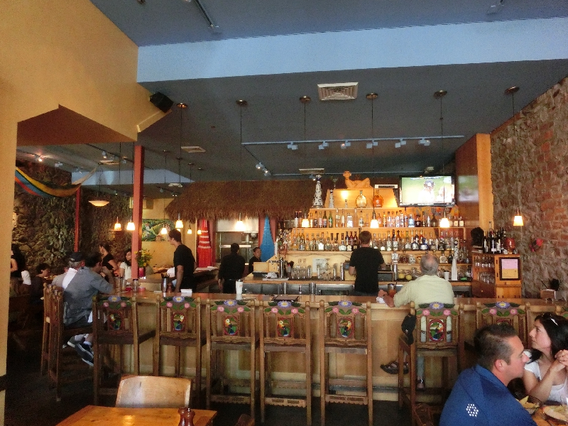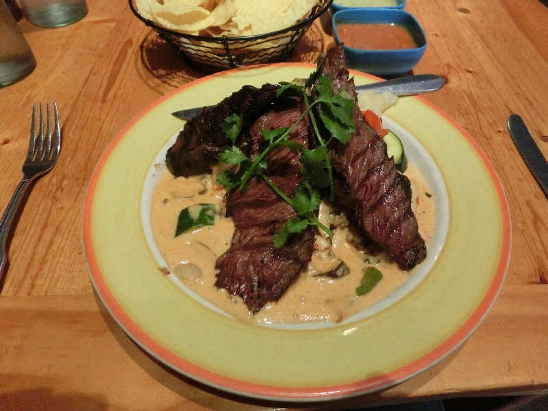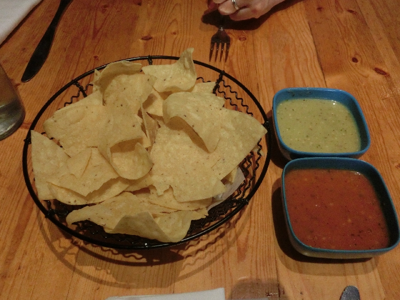 さて、そろそろ1時。お昼ごはんかな。今日が最終日なのでもう一度ステーキを食べようと思い、調べていたSaddleというステーキレストランに行ってみるが、どうもやっていない。特に定休日は書いていなかったが、誰もいないのでどうしようもない。うーん、残念だなあ。特に他にはあてがなかったので、もう一度街の中心に戻る。すると、すぐににぎわっているメキシコ料理のお店を見つけた。メニューを見るとステーキもありそうなので、ここにしますか。あんまりさまよっている時間もないしね。中に入ると結構広いぞ。テーブルに着くと、まず出てきたのがナチョス。赤と緑のソースも出てきたが、どちらも辛いねえ。でもこのメキシコらしいスパイシーさがいいですね。しばらくして、注文したステーキが登場。お肉も野菜もたっぷりで、メキシカンなソースがかかっている。見た目よりはずっとあっさりしたこのソースと、ミディアムに焼かれた赤身のお肉をいただく。うん、このしっかりした歯ごたえがいいなあ。野菜も味がしっかりしておいしいが、芋など根菜が多くちょっと食べきるのは厳しいかな。お肉はしっかり完食し、野菜を残してしまうのはごめんなさい。おいしかったです、ごちそうさまでした。ふう、満腹。この数日間で結構ポテトを食べているが、あまり葉物の野菜を食べていないので夜は野菜をしっかり取りたいな。