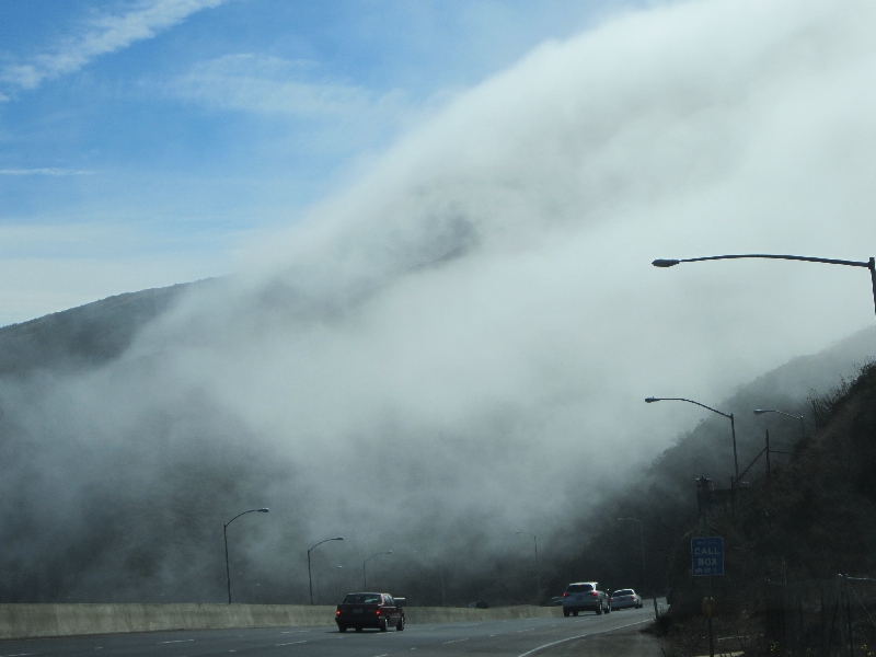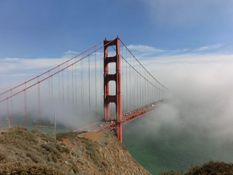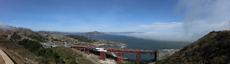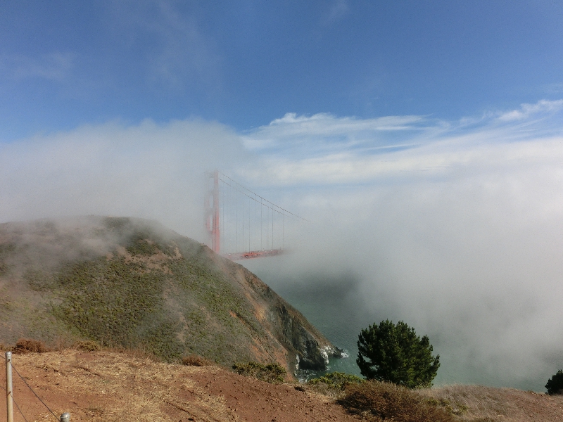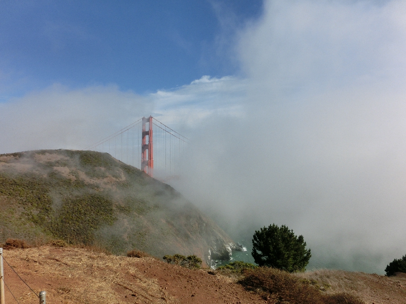 このまま走るとゴールデンゲートブリッジを通るのだが、その手前のビューポイントへ行きたい。どこで降りればいいのか直前までわからなかったが、そろそろ近づいて来た頃に短いトンネルを抜けると突然赤い橋の一部が見えてきた。すると、これまでは快晴の中を走ってきたのが突然白い霧が立ち込めてきた。なんだこれは?確かにサンフランシスコは霧が多いとは聞いていたが、こんなにいい天気の真昼間に、これだけの霧がしかもこの場所だけに突然に出ているとはなんて不思議なところなんだ。橋のすぐ手前にある出口をでて、山道を登っていく。すると、どんどんと霧の中に入っていく。しばらく行くと車が何台か停まっているところがあったので、なんとか場所を見つけて駐車。車を降りると・・・寒い!風が強くて、とにかく寒い。さっきのソノマの日差しに感じた暑さが嘘のように、とにかく寒く、とにかく風が強く、その風にあおられるように霧がわいたり消えたりしている。その霧で橋が見えたり隠れたりを短時間で繰り返しているなんて、これは不思議な景色だなあ・・・ | ||||||