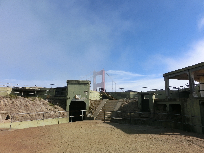 とにかくビューポイントである、バッテリースペンサーに行きましょう。この場所は昔は砲台だったらしく、今も砲座や古い建物などの名残を見ることができる。展望台までの道でも思いっきり風を受け、そして展望台に到着すると吹きっさらしなのでさらに風を受ける。目の前に橋があるのだが、霧でほとんど見えなくなったりくっきり見えたり、一瞬一瞬に表情を変える。そして遠く聞こえてくるのが船の霧笛の音、なんとも風情があるがとにかく風が強すぎ。とてもここには長居できないので、踏ん張りながら写真を何枚か撮って退散しましょう。晴れているときは対岸のサンフランシスコの街が見えるらしいが、今日は何も見えない。それ自体は残念でもあるが、なかなかこんな不思議な霧の景色は見られない。ここは予想外に楽しかったです。展望台を降り、橋の手前辺りの景色を見ると快晴と濃霧にくっきり別れている。地形や気流、海流などさまざまな要因があるのだろうが、ほんとに不思議。ちなみにこの橋は、今年75周年を迎えたそうで、そんな昔からこんな立派な橋があったなんて、感服しますね。 | ||||||