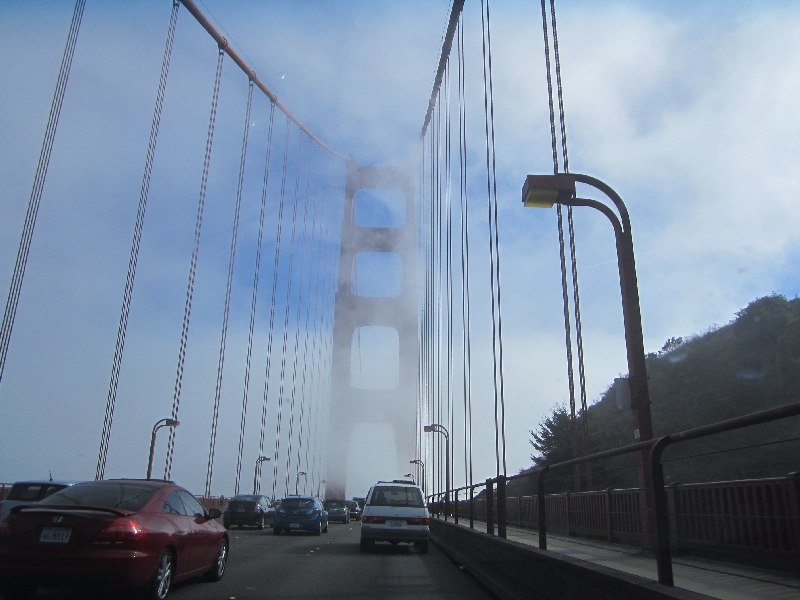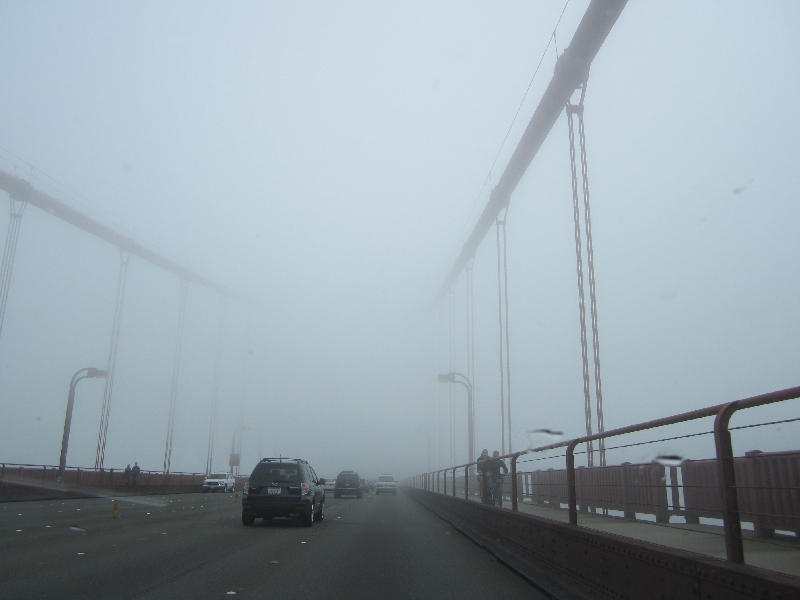 車に戻り、橋を渡ろう。かなりの霧と風なので、さすがのアメリカ人たちも徐行運転だね。この橋は、両側に歩道があるので歩いている人や自転車で渡っている人が結構いる。薄着の人も多いが、この風の中かなり寒いだろうなあ。天気がよければ海やサンフランシスコ市街を見ながら渡ってみるのも気持ちいいだろうね。