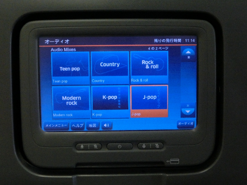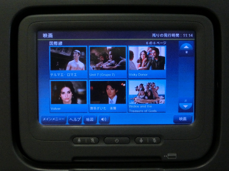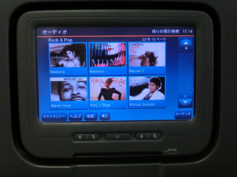 ただ、この音楽が微妙すぎる。J-POPを聞いてみたが、PerfumeやAKB48などの数曲を除くと正直わけがわからない。タイトルがわかる一覧もなく、誰かもわからない曲をずっと聞いているのも厳しいので、洋楽でも聞きますか。こちらはさすがアメリカの航空会社、新旧かなり充実している。しばらくは洋楽を楽しみましょう。いつのまにやら眠りに落ちていたり、また音楽を聞いたりを繰り返す。ある程度寝たところでちょっと目が覚めてきたので、映画でも見る。いろいろあるが、「ミッションインポッシブル3」を見てみる。途中で寝てしまい、目が覚めたらおまえが犯人か、が突然分かってしまってビックリした。では続いては楽なディズニー系。BRAVEというのは「メリダとおそろしの森」のことだよね。まあこんな機会でもないと見ることもないので、見てみますか。こうしているうちに時間は過ぎるが、やっぱりエコノミープラス、少し席が広い分随分と足下が楽だ。途中で軽食タイムがあったのだが、ポテトチップとキットカットとプレッツェルとクッキーと、お菓子のオンパレード。へんなもの出されるよりよっぽどマシだが、さすがにお菓子ばかり食べられないのでポテトチップだけいただきましょう。