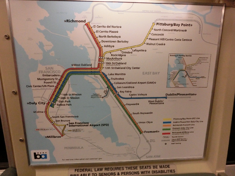 結局2時間くらいしか寝ていない状態で朝を迎えた。7時になり、シャワーを浴びる。最後の荷造りを済ませ、7時半過ぎにホテルをチェックアウト。さすが日系ホテル、気持ちよく過ごせました。外に出ると、やっぱりかなり肌寒い。こんな中でも半袖短パンの人もいるが、体のつくりが違うんだな。ケーブルカーのところを通ると、さすがにこの時間では昨日ほどの人はいない。でも並んでいる人もいるので、やっぱり観光名所だね。地下に降り、Bartのチケットを買うのだが、これが実に難しかった。買いたいチケットは8.25ドルが2枚なのだが、まず20ドル入れる。次に人数を指定すると、一人当たり10ドルという表示が出る。その後は1ドル下げる(Subtact1$)のボタンを2回押して8ドルにして、5セント上げる(Add5¢)のボタンを5回押して8.25ドルにする。するとようやく合計16.50ドルの表示が出て、プリントボタンを押すとカード式のチケットが2枚出てくる。おまけにおつりがすべてクォーターで出てきたので、合計14枚。財布がジャラジャラではないか。まあ何とか買えてよかった。改札を通り、ホームへと降りる。時刻表を見ると、空港行の電車は出たばっかり。うーん、チケット買うのに手間取ったからなあ、次は15分後か、と思っているとなぜか次に来た電車が空港行き。遅れていたのかなあ。まあラッキーだ。あとはこれで30分ほどで空港に到着。