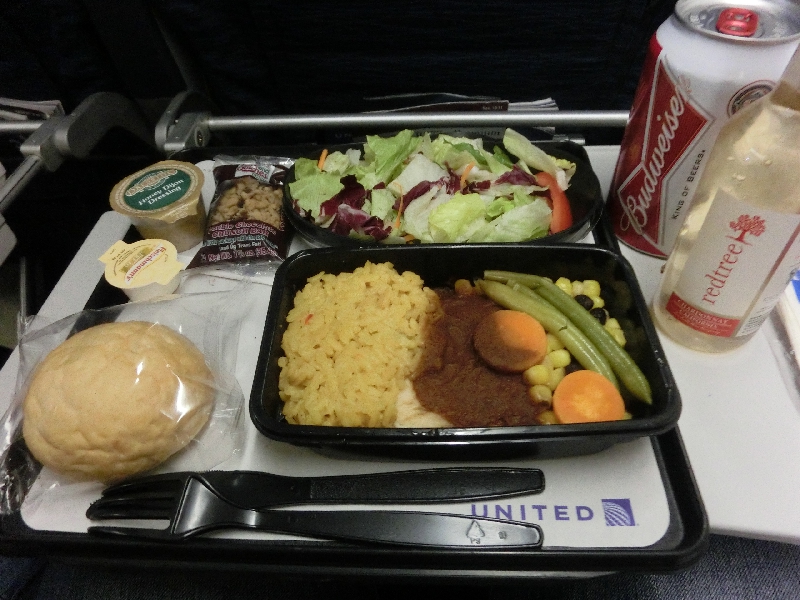 ここでまずはドリンクサービスが普通だが、いきなり機内食が始まった。11時間もあるフライトなのでもっとゆっくりすればいいのにね。チキンとビーフの選択だが、ビーフはずいぶん食べたのでチキンにしましょう。ドリンクはアメリカなのでバドワイザー。さーちゃんは白ワイン、空の旅に乾杯。さて、いただきますか。これがサラダとメインのみなので、すぐに食べ終わってしまうなあ。行きの全日空は前菜もありチーズもありなので楽しめたが、これはさくっとたべておしまい。しかも正直おいしくない。デザートにあたるのがクッキーで、思ったほどは甘ったるくなかったので完食したがコーヒーとともにいただけば機内食は終了。全日空の方が良かったなあ。うーん、あとまだ10時間以上あるのに機内は早速夜モード。しかたない、音楽でも聞いてのんびりしますか。