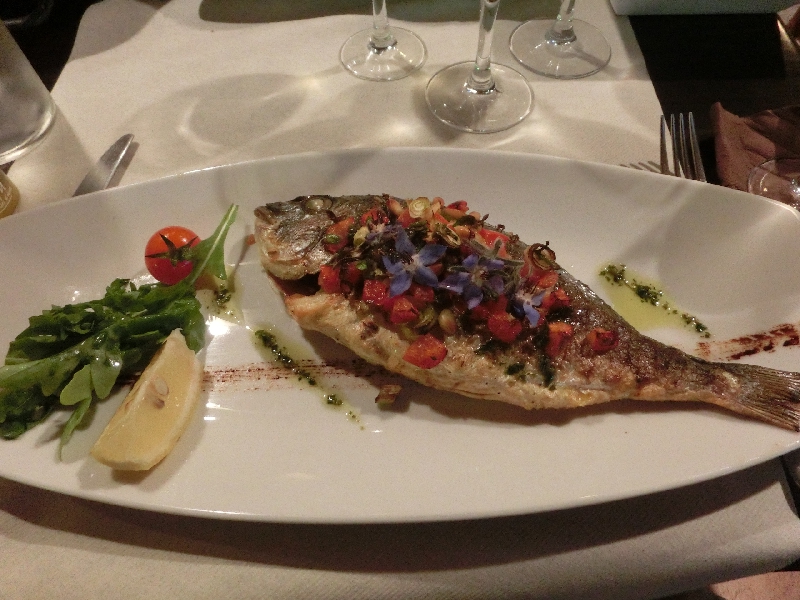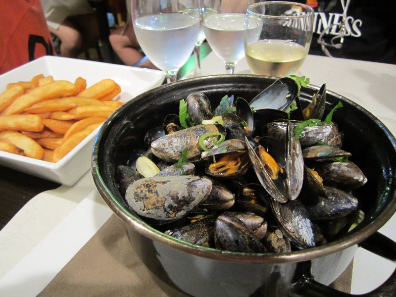 さて、もう22時だ。日本時間は朝5時なので眠いがおなかもすいたし、ここはちゃんと食べておかないと。ホテルから出て、海側から少し入った通りを歩く。レストランはいろいろあるようだな。しばらく歩くと歩行者天国になっているにぎやかなエリアがあり、たくさんのレストランが並んでいる。どの店もにぎわっているようだが、どうしようかな。軽く食べられればいいのだが意外とそれが難しいのがフランス。まあ適当に入ってましょうか。周りの人の食べている魚がおいしそうだったので、タイのグリルとムール貝をいただきましょう。ワインはプロバンスのロゼ、今はハーフボトルで十分だ。ふう、それにしても長い旅であった。でもその割には眠さも疲労もましなんだよね。日常生活でもなぜか昼眠く夜目が覚める生活なので、ずっと時差ぼけしてるような感じ。その分今回はあまり時差ぼけしないかもしれない。そんなことを考えていると、ムール貝登場。大きな鍋にたくさんのムール貝、季節的に身が小ぶりではあるが、しっかりした貝の味がして白ワインにあう。やっぱりムール貝はこれが一番かな。付け合せのポテトがかなりの量だが、おいしいので結構進むぞ。ほどなく鯛が登場。丸一匹の魚を見ると、なんだかテンションあがりますね。例によってこれは美しく頂きましょう。トマトや松の実に加え、スミレが乗っているのが南仏風なのかな。特に気にならずに食べちゃったけどね。魚に貝に、まずは海の幸をしっかりいただき満足でした(45E)。