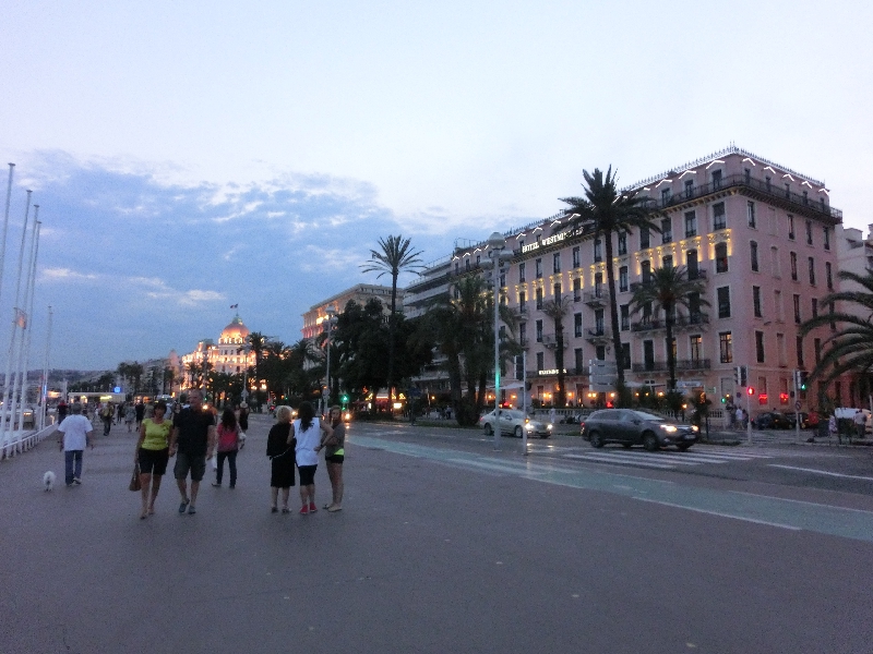 荷物を無事に受け取り、街へと向かう。タクシーに乗ろうと思ったら1台もおらず、代わりにバスが目の前から出そうなのでそちらに乗り込む(12E)。すぐに出発したのはいいが、隣のターミナルで少し待ち時間があったので結構時間が掛かったかもしれないけどね。空港を出るとすぐに海岸沿いの大通りになるのだが、何のアナウンスもないままだが周りの景色を見ながらほかのお客さんは降りていく。我々はCongressというところで降りるのだが、乗るときに聞いたこともあってその時だけ到着時に駅名を言ってくれました。ニースの大通り、プロムナードデザングレには多くの人が散策を楽しんでいるようだ。