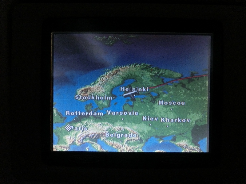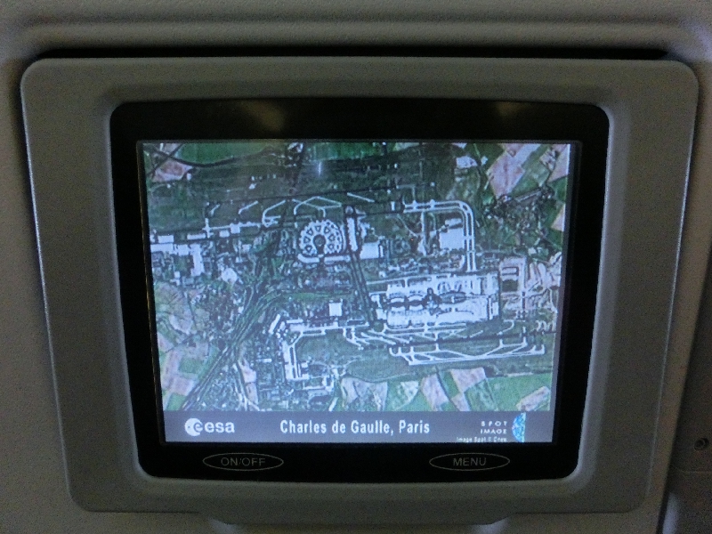 ヘルシンキを過ぎ、だんだんパリが近づいてきたぞ。しばらくすると機内の明かりがつき、到着前の軽食タイム。ここではお酒はちょっと控えておこうと思っていたら、サラダとスモークチキンという冷えたワインが間違いなくあう組み合わせ。では飲まざるを得ませんねえ。酸味の効いたドレッシングが白ワインといい感じで、肉系も冷たくさっぱりだ。ごきげんにいただき、あとは到着まで。モニタに運行状況などが出る中で飛んでいる付近の航空写真がいろいろと出るのだが、パリ到着前ということもありパリ付近の航空写真がたくさん表示される。空港やサンドニのスタジアム、エッフェル塔や凱旋門、チュイルリー公園など、パリの名所が次々と表示されるのが楽しい。そうこうするうちに飛行機は次第に高度を落としていき、なんと定刻より30分以上も早く、パリ・シャルルドゴール空港に到着した。わりと寝られたこともあり、思ったよりは疲れていないぞ。日本時間にすると、普段ではまだ普通に起きている時間だしね。 | ||||||