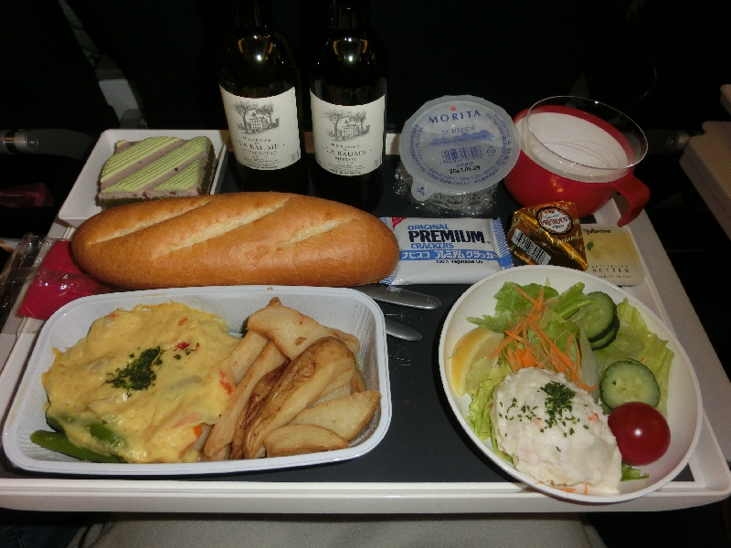 このあと機内食の昼ごはんだが、わりとゆっくり目。時間はたっぷりあるし、いいですよ。和食は豚肉のかつとじで、洋食は鶏肉のソテーカレークリームソース。揚げ物っていうのもあまり気分ではないし、エールフランスということでやっぱりワインを飲みたいので、洋食にしましょうか。エールフランスは事前に予約すれば少しグレードアップした機内食もいただけるようだが、そうしている人はあまりいないようだ。ドリンクのワゴンとタイミングが合わなそうだし、まあまずは普通のをいただいてからだよね。まずは白ワインで乾杯。ポテトサラダや鶏肉ソテーと合わせながらゴキゲンにいただく。20年近く前に乗ったときよりは機内食のレベルが落ちた気もするが、それはどこの航空会社も同じかな。でも何せ前回のユナイテッド機内食があまりにひどすぎたので、これで十分合格点。フランスらしく、パンもおいしいしね。続いての赤ワインは、パンやチーズと合わせましょう。デザートの抹茶ケーキまで完食し、ごちそうさまでした。嫌いな人的にはチーズがNGだったらしいが・・・ | ||||||