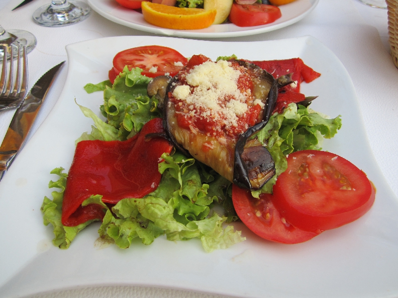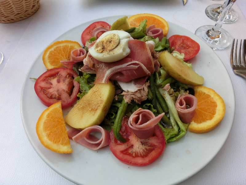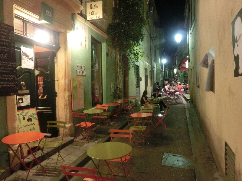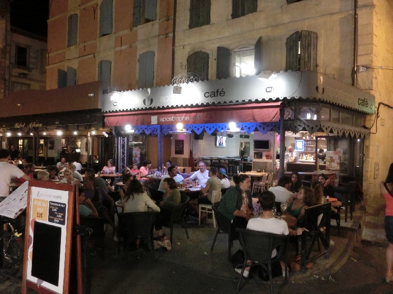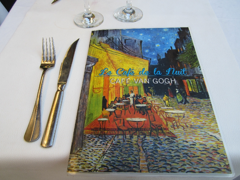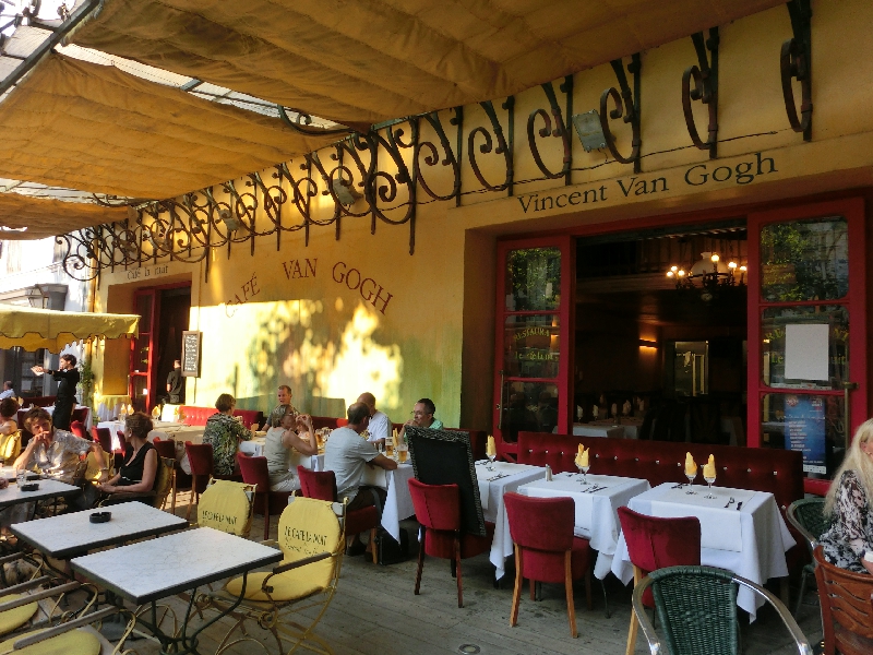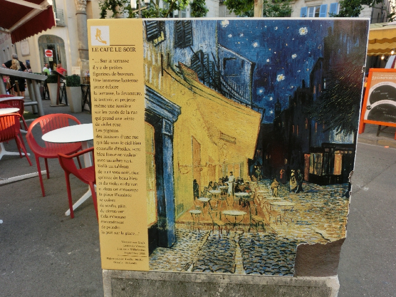 さらに歩くと、カフェがたくさん集まる広場に来た。ここはフォーロム広場という場所で、その中の一つが、ゴッホの絵のモデルともなった、あの有名な夜のカフェ。確かに黄色い外観がその絵を彷彿とさせる。すぐ隣にもカフェがあるのであの絵と同じ構図では見れないが、でもなかなかいい感じのカフェですね。お昼が遅かったのであまりおなかはすいていないが、今日はこのカフェで過ごす目的もあり、軽く何か頂くことにしましょうか。ゴッホのサラダとやらと、プロバンス盛り合わせとやらを頼み、ここではビールで乾杯しましょう。やっぱり日は傾いても暑いなあ。冷たいビールは喉にしみわたります。しばらくして運ばれてきたのは、巨大な一皿。ゴッホサラダはハムにいろんな野菜、卵に生ハム、リンゴにオレンジといろんなものがどっさり乗った一品。食べごたえがあるなあ。プロバンス盛り合わせはナスにトマト、パプリカと夏野菜の宝庫。どちらもおいしいし、野菜がたっぷり食べられていいですね。日は落ちたが、まだ暗くなるには早いし、この際もう少しこのあたりで楽しみたいのですぐ近くのカフェへと移動しますか。お会計にやたらと時間が掛かるのはもう慣れたかな。レジで払う日本の会計システムが早くも懐かしい・・・