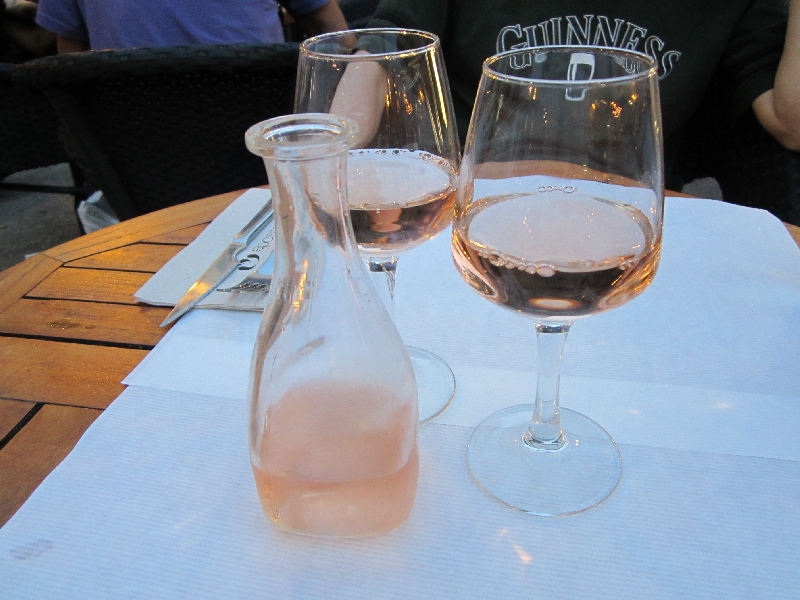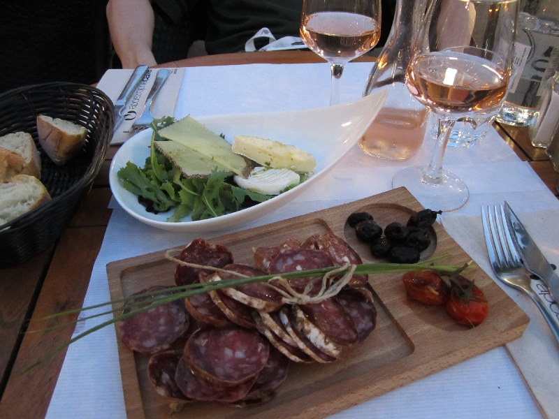 すぐ近くにあるカフェに入る。こちらはほぼ満席でにぎやかだが、なんとか席をゲット。メニューをもらうという行為が入ると注文に時間がかかるのは仕方がないが、メニューをしっかり見たいよね・・・ここではロゼワインの小さなピッチャーと、サラミとチーズ。どんなのが来るかな。するとサラミはこれは一本分か?というくらいの量が来た。切り方もざっくりしているので、妙に分厚かったりしているが、味はうまいぞ。チーズは一つはシェーブル、あとはカマンベールとウォッシュの間のようなものと、パルミジャーノっぽいがちょっと違うかな、と思うようなもの。結局よくわからないのだが、どれもおいしいです。二日続けてシェーブルを食べているが、やっぱりこちらで食べるとみずみずしい感じがおいしいなあ。少しオリーブオイルをかけるとまたいい感じ。 ワインが進むのはいいのだが、問題は蚊。とにかく蚊が寄ってきて、落ち着いて食べられない。本当ならばこのあと赤ワインでも行こうと思っていたが、ちょっともうどうしようもないのでここまでにしよう。他の人はどうなんだろう、柔肌日本人は狙われやすいのか、他の人たちは気にしてないのか・・・ベープは今部屋で働いているが、戦うべきは部屋のハエより今の蚊だよなあ。虫よけスプレーもあるのに部屋に置いてきたのが残念。では行きますか。