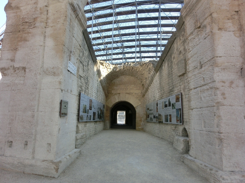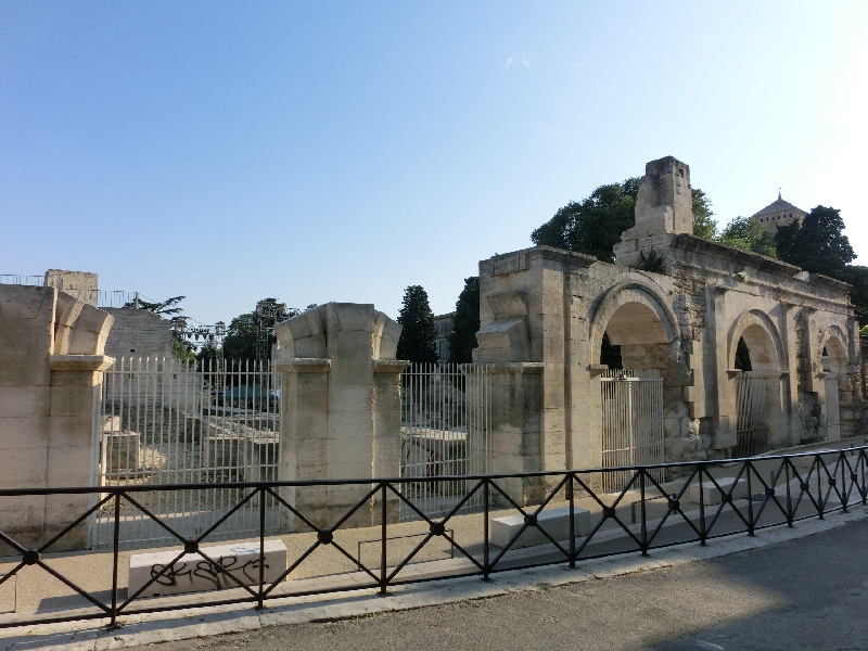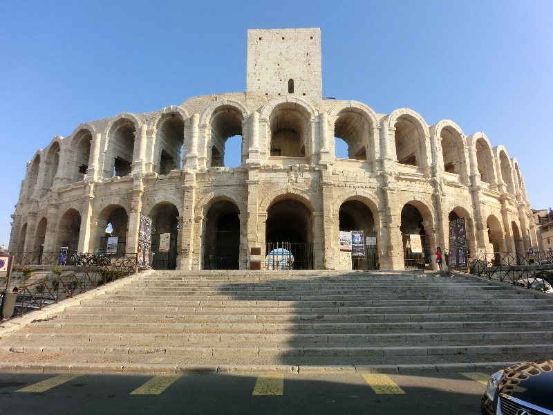 もう夕方になったし、街歩きに出ますか。外に出ると、さらに大きな音だなあ。今はいいが、夜も何かやるのかな?あまり遅い時間は勘弁してね。さて、その広場を抜ける道が2本あるのだが、そのどちらからも前に巨大な闘技場が見える。だまし絵のある家を見ながら、少しずつ歩いて行こう。近づくにつれて、その大きさが実感できる。少し高くなったところにあるので、見下ろされるような威圧感を感じつつ闘技場前に到着。これはでかいぞ。ここアルルの闘技場は、当時は2万人が収容可能で直径が136メートルとフランスでは最大らしい。ここでは猛獣と人間の血なまぐさい戦いが何度も行われたのかなあ。いかにもヨーロッパの古い町、という感じですね。この時期は闘技場にていろいろとショーが行われているようで、よくは分からないが馬術のショーなどがあるようだ。どんな感じなんだろうね。機会があれば見て見たいものです。 | ||||||