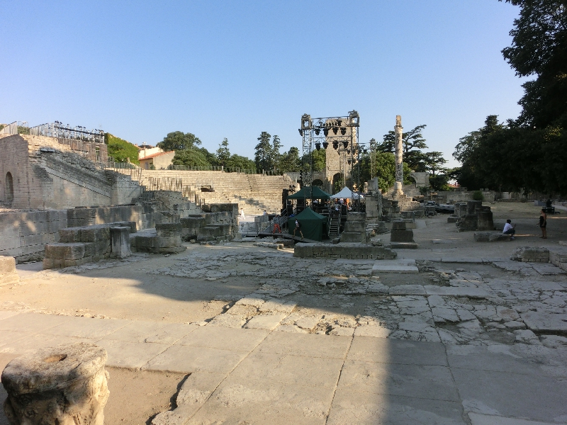 そんな雰囲気を醸し出すのがもう一つ、古代劇場だ。紀元前1世紀くらいのものらしく、当時は1万人を収容する劇場だったらしい。今は中で何やら準備中で、ショーかコンサートでもが行われるのかな。この時期の南仏は毎日いろんなところで音楽イベントをやっているそうです。石畳の街をぶらぶら歩く。