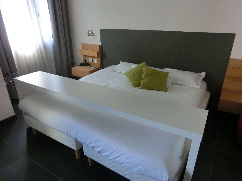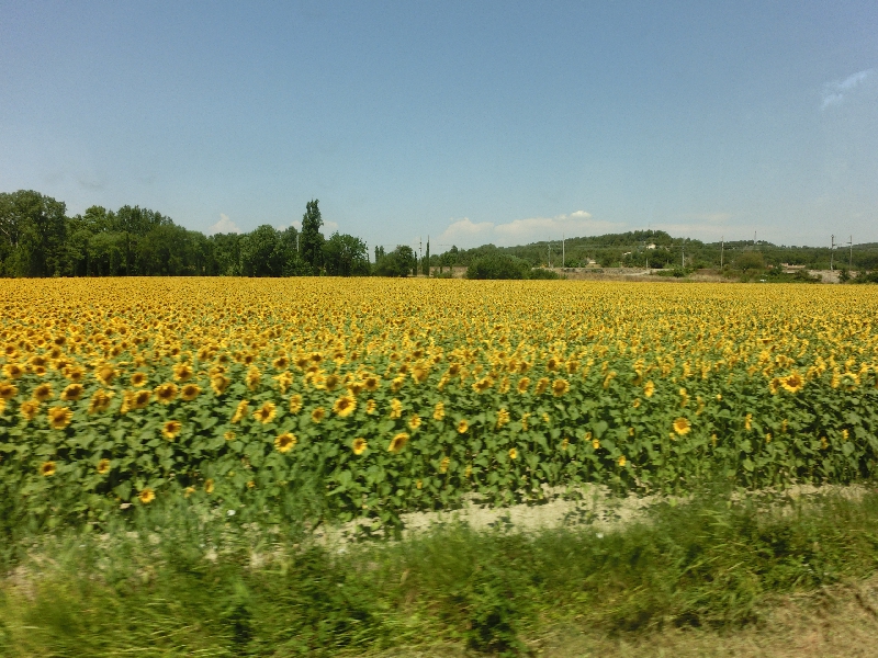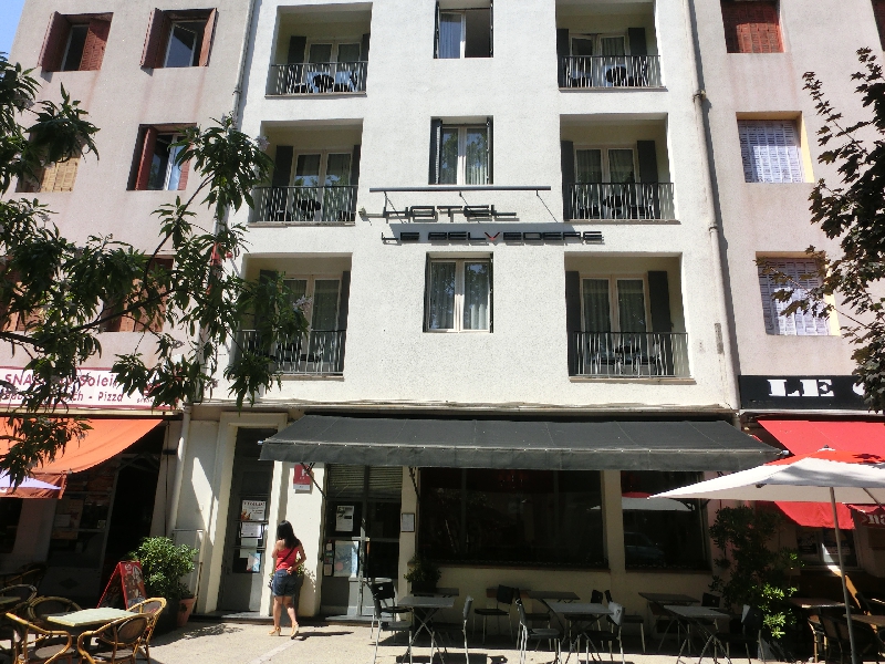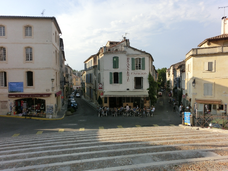 車窓にはフランスの大地が広がる。少しの間高速を走り、そのあとは田舎道を走る。しばらく走ると、突然見えたのがひまわり畑。すごい、満開だ!ちょうどいい時期だとは思っていたが、黄色い花が太陽に向けてたくさん咲いている。これはいい景色だなあ。途中タラスコンという駅に停まり、多くの人が乗ってきた。このあとアルルまでの道は、そこかしこにひまわり畑が広がっている。今日は14:30からひまわりの中を走るひまわり列車に乗る予定なので、こんな満開だとすごい景色だろうな。バスはアルルにほぼ定刻の13:35に到着。ちょうどいい。すぐ目の前にアルル旧市街の城壁があるので、中に入る。しばらく行くと広場があり、そこに面したBelvedereホテルが今日の宿。早速チェックインだ。部屋は3階だが、ここはエレベーターがないのね・・・頑張って登り、部屋に到着。大きなベットのあるゆったりした部屋で、広場が一望できる。これはいいですね。ただなぜかハエが飛び交っているので、何匹かはたたきつぶし、残りは携帯用ベープでもつけておきますか。 | ||||||