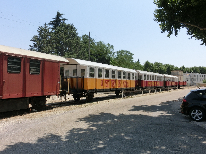 さて、何はともあれまずはひまわり列車。アルピーユ鉄道というもので正確な時間は実はわかっていないが、いろんなHP情報だとおそらく毎日10:30と14:30のはず。今日は絶好の天気でもあるし、まずは向かいましょう。さっき通った道を戻り、国鉄の線路沿いを行く。本当にこんな道?と思うような道を行くのだが、それは事前にブログで確認済み。そしてしばらく行くと、アルピーユ鉄道の看板があり、オープンな観光用の車両がありました。ここだな。とはいえ、人の気配が全くない。14:30ならあと10分ちょっとなので、ほかに人がいてもいいし受付のようなものがあってもいいと思うのだが・・・と、あたりを見渡していると2人のおじさん発見。ちょっと聞いてみますか。すると・・・このアトラクションは昨年で終了し、もうやっていないとのこと。えっ、どういうこと?やってないって、やってないってことですか?曜日運航で今日はないとか13:30に出たとかはありえると思っていたが、まさか運行すらされていないことは想定していなかった。いろんな人のブログには絶賛されていたし、海外のサイトもいろいろあったのに・・・最新情報だけが入手できていませんでした。これは残念、残念すぎる。
