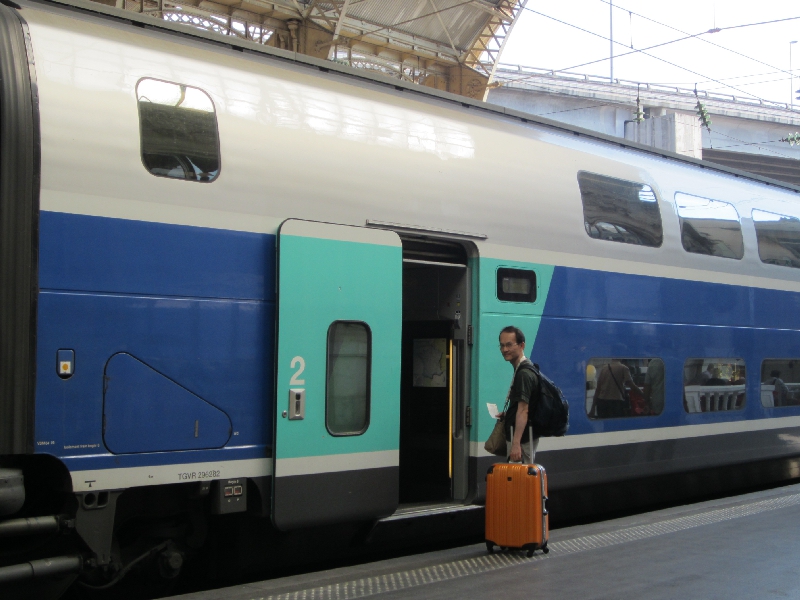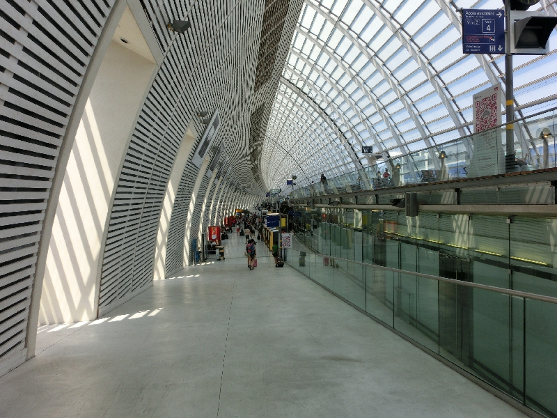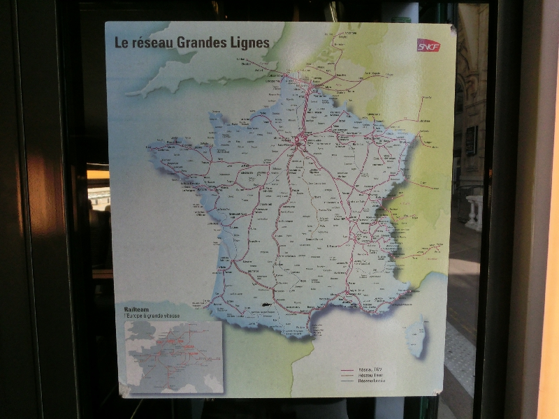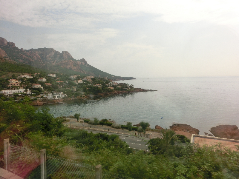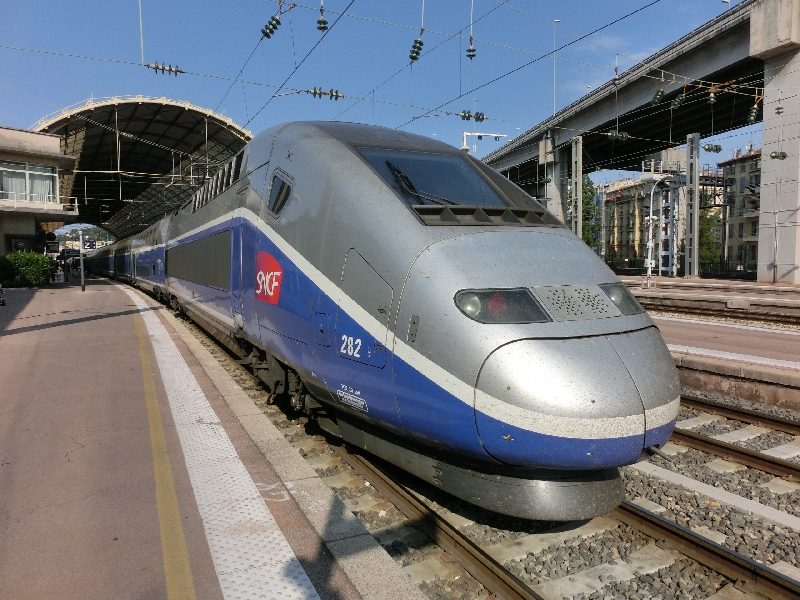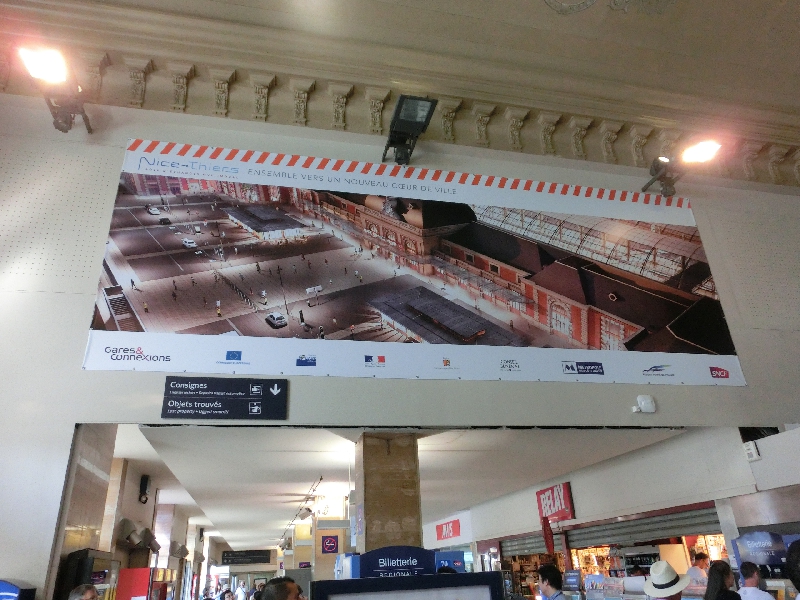 ニース駅前は工事の真っ最中だが、近い将来このあたりもきれいになるのかな。完成図が大きく出ていました。さて、行き先掲示板を見ると、これから乗るTGVには特に遅れは無いようだがまだホームがわからない。そのせいもあって、改札前は人がたまっている。こんなところもうまく改善できればいいのにねえ。キオスクの本を見たりしながら時間をつぶしたりしているうちに、掲示板にホームが表示されました。すぐ目の前のAホーム、階段を使う必要がないのでラッキーだ。もうすでに到着しているTGVに乗り込み、ほっと一息。定刻の9時34分になり、TGVはアナウンスもなくゆっくりとニース駅を出発した。