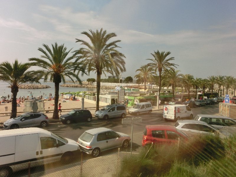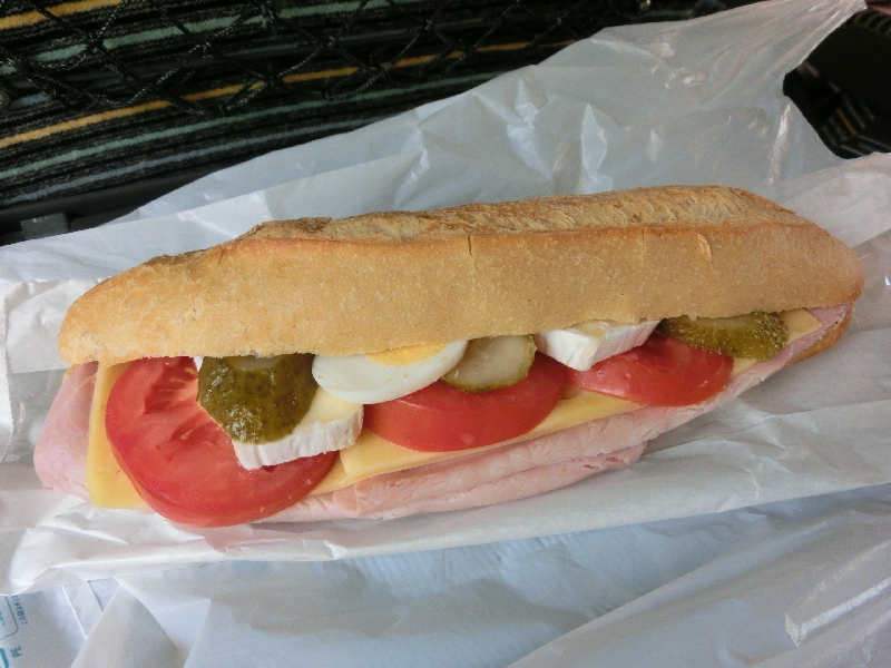 出発後しばらくして、左手には青い海が見えてきた。この路線はカンヌ、トゥーロンと海辺のリゾートエリアを走るのだ。TGVにしてはあまりスピードは出ていないようだが、このあたりは専用線路ではないので仕方ないのかな。山形新幹線みたいなものですね。さて、では朝ごはん。さっき買ったサンドイッチだが、ハムやチーズ、ピクルスや卵などたくさんの具が入っている。若干の食べにくさはうまく工夫して、とにかくパンそのものがうまい。やっぱりフランスはパンがうまいねえ。じっくりと味わいながら、サンドイッチを完食。とりあえず朝はこんなところでごちそうさまでした。さて、TGVは途中の駅で人が乗ってくるので、トゥーロンを出るころにはほぼ席が埋まっている状態。そんな中、いろんな場所で携帯の着信音が大きな音でなるわ、それに出て延々しゃべり続ける奴もいれば、とにかく電話については世界統一運用がなかなかできないのかあ。ちょっと自由すぎる感じがします。人目があまり気にならず、人のことも気にならずという文化なのかなあ。
