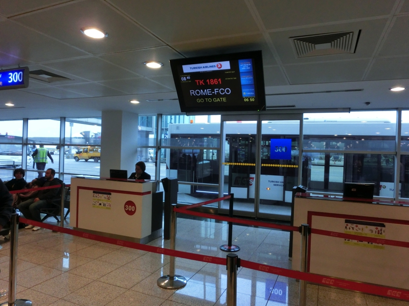 7時半をすぎ、そろそろ搭乗時間。ゲートの近くに移動して待っていると、ほどなく搭乗手続きが開始となった。パスポートチェックを行い、バスへと乗り込む。外の空気はひんやりとしているが、日本と同じくらいかな。空港内をかなりの距離走ったところにローマ行きの飛行機がありました。早速乗り込みましょう。座席が3−3で通路から2席を押さえていたのだが、結局窓際の席には誰も来なかったのでゆったり座れることになってラッキー。