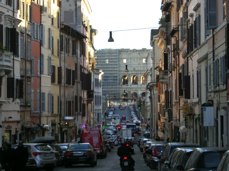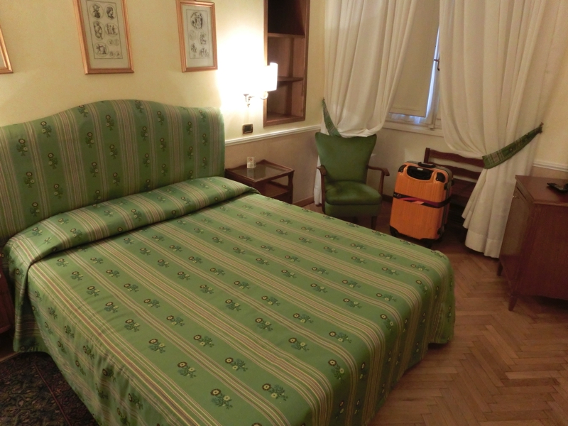 定刻になり、電車は出発。空港付近は曇り空だったが、街に近づくにつれて青空が広がってきたぞ。12時をすぎた頃、ローマ・テルミニ駅に到着した。駅構内はいろいろなところで工事をしているようだが、見覚えのある駅だ。まずはホテルへと向かおう。駅の横側からでると見覚えのあるマクドナルド。そこから少し歩いたところに今日のホテル、Bettoja Hotel Massimo d’Azeglioに到着した。本来のチェックイン時間よりは少し早いが、部屋に入れればいいが・・・無事に入れました。ここはかなり年期の入ったホテルではあるが、場所が便利。荷物を部屋において少し休憩し、では街歩きへと出発しましょう。