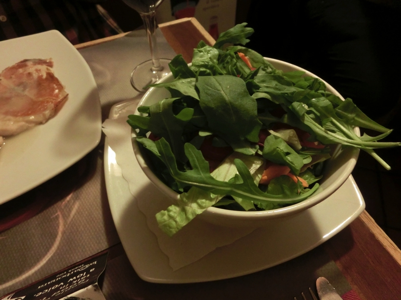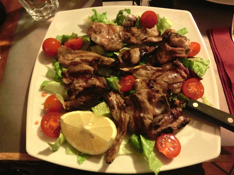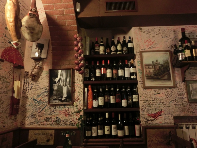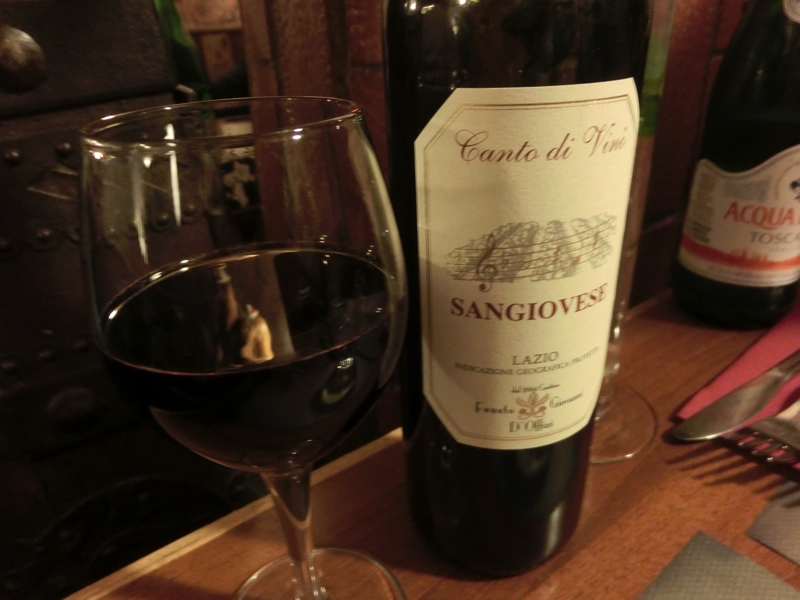 カルボナーラは卵とチーズの風味がしっかりと感じられ、思ったよりもあっさりとした味わい。こちらもおいしくいただきました。そして続いてはメイン、サルティンボッカは厚めの豚肉に生ハムがのせられていて、バターのソースがこれもあっさり目で食べやすくておいしい。羊の炭火焼はたっぷりの野菜とともにいただくのだが、柔らかい肉に香ばしい炭の香りがいいですね。ちょっと骨が多いので食べるのにはちょっと手間がかかるが、そこは日本人、骨をうまく外しながら無駄なくいただきました。夜行あけの体にイタリア初の食事としてはたっぷりといただいたが、おいしく完食。ワインもボトル一本を空け、食後にはエスプレッソをいただき、ごちそうさまでした(73E)。