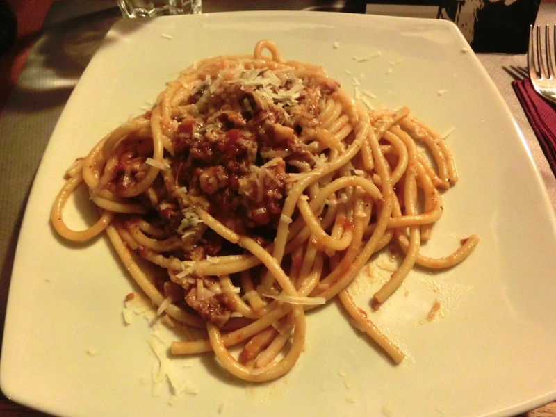 さて、どうしようか。今日はこの昼ごはんをしっかり食べることにしたいので、パスタとメインをそれぞれ頼みましょう。パスタはローマらしくカルボナーラとアマトリチャーナ、メインもローマらしくサルティンボッカと羊の炭火焼。それにサラダをつけて、いい感じでしょう。まずはワイン、ハウスワインとしてオーダーしたのはボトルのサンジョベーゼ。少しスパイシーな味わいで、パスタにも肉にも合いそうだ。しばらくして、パスタが登場。どちらもおいしそうだ。アマトリチャーナはトマトソースとベーコンの旨味が十分に楽しめる。Bucatiniというパスタは少し太めマカロニのように小さな穴があいていて、おいしいのだがその太さのせいでちょっとフォークには巻きづらい。とはいえおいしくいただきました。