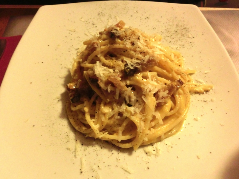 お昼時なので、とにかくまずは昼ごはん。ホテルからCavour通りをコロッセオ方面に歩き、サンタマリアマジョーレ教会をすぎた頃に右斜めに入る道を進むと、目的のお店、La Carbonaraに到着した。この辺りは人通りがあまりなく、道もきれいではないのでとても夜には歩きたくない感じだが、お店に入ると満席に近い状態でにぎわっていました。
