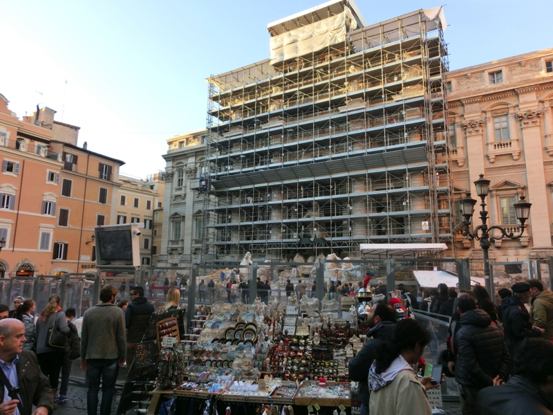 たくさん食べたのでしっかりと歩こう。道の向こうにコロッセオが見えているが、やっぱりローマといえばまずはトレビの泉に行っておかないとね。道が入り組んでいて分かりづらいが、地図を見ながらなんとかたどり着いたトレビの泉は・・・なんと工事中。いつもならば泉の周りにたくさんの人が集まって、後ろ向きにコインを投げ入れたりしているのだが、泉の周りにはガラスの壁が設けられ、水が抜かれている。とはいえ工事中ならではということなのか、足場が泉の中までできていて、ここに観光客は入ることができるのだ。ということで、普段は近寄れないはずの石像の近くまで行く。海の王様ネプチューンは足場の向こうにいるのだが、その周りの海神や海馬は間近にみられる。まあこんな状態は滅多にみられないのでよかったかな。さすがに水のない泉にコインを投げ込むわけにも行かないので、願いを込めて「エアコイン」を投げ込んでおきました。またローマには来たいからね。