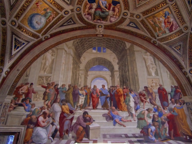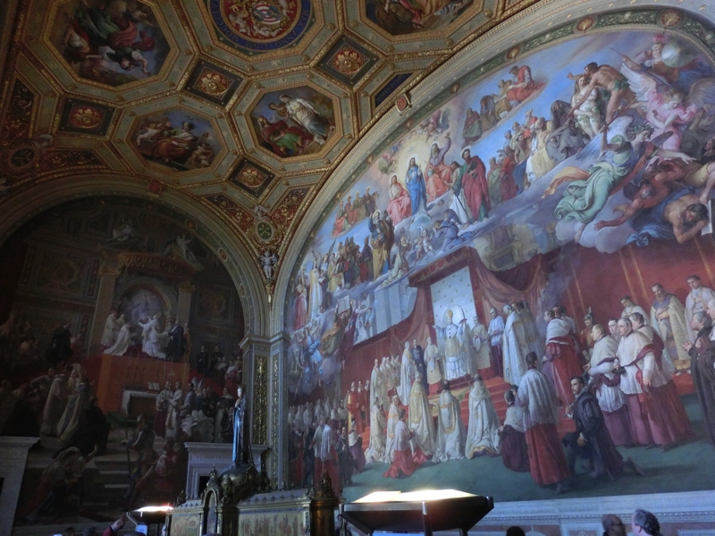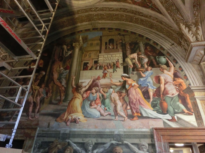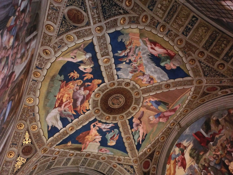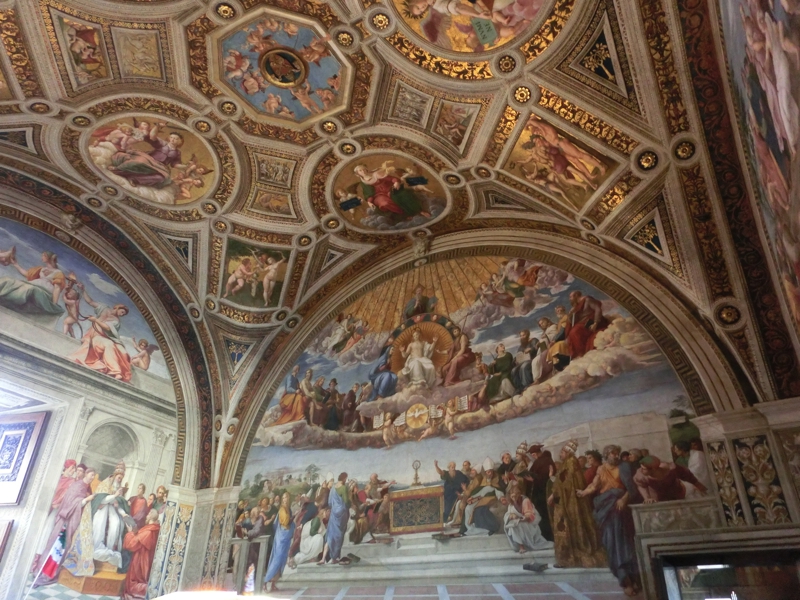 そして、ラファエロの間へと入ってきた。ここはいったん渡り廊下のような所に出て、4つの部屋を順に見ていく。3つ目の「署名の間」にあるのは有名な「アテネの学堂」(この章5枚目)。センターにいる赤い服がプラトンで、青い服がアリストテレスらしく、他にもソクラテスやピタゴラス、アルキメデスなど古代ギリシャの有名な哲学者や学者などが描かれている。足場が組まれているところもあるが、修復中なのかな。