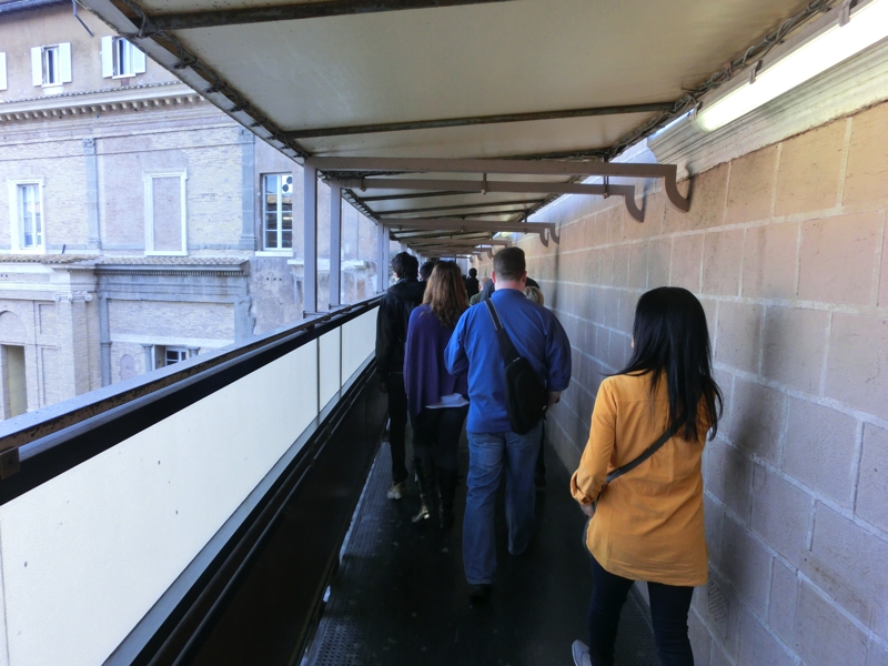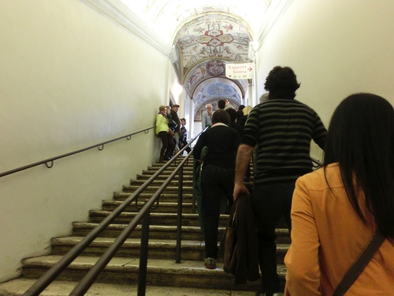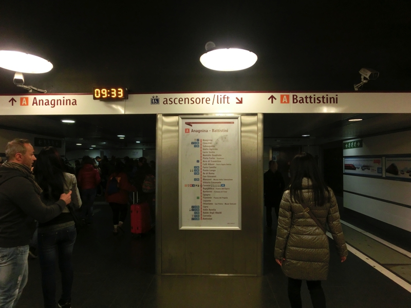 外はきれいな青空。少しひんやりしていて気持ちがいい。テルミニ駅はごちゃごちゃした感じだが、ここはいつかきれいになるのだろうか。一国の首都の駅としてはもう少しなんとかした方が・・・メトロの駅に到着し、チケットを購入(3E)。自動改札がなかなか通れなかったうまくのは切符の向きのせいでした。日本のように表裏どうでも反応してくれるわけではないので要注意。地下鉄A線に乗って、Ottaviano駅で下車。乗っていたほとんどの人がここでおりる。ここからはバチカン市国へ向かう人と、バチカン美術館に向かう人に分かれる。今回の我々の目的は、バチカン博物館からのシスティーナ礼拝堂。