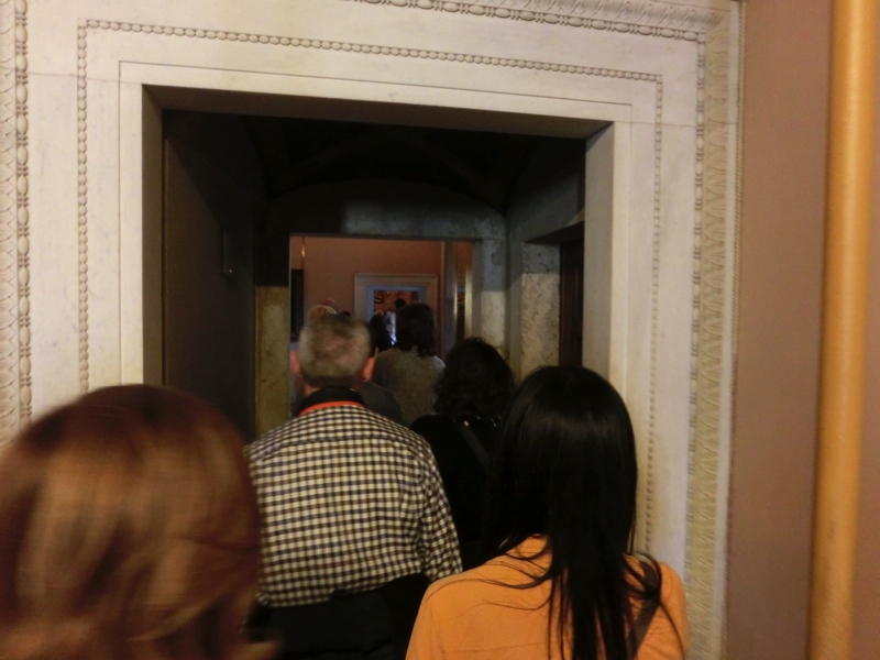 しばらく歩くと、高い石壁沿いに行列を発見。ここだな。でも我々は事前予約済みなので、長い列を尻目にどんどん前へと進む。ちゃんと並ぶ人と進む人が別れて歩けるようになっているのはいいですね。ここで順番を待っていたら、1時間くらいはかかっただろうなあ。博物館前に到着し、早速中に入る。空港のようなセキュリティチェックを抜け、予約票とチケットを交換し、ゲートを通過。この博物館は、多くの展示があるようなので、ポイントを押さえて進んでいきましょうか
